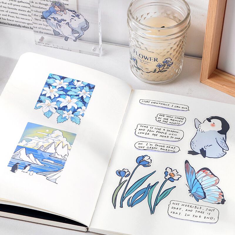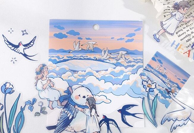 青を基調とした優しい絵本の世界を感じるデザインのシールです。手帳やアルバムを彩るだけでなく、さまざまなクラフトやコラージュにもおすすめの商品です。