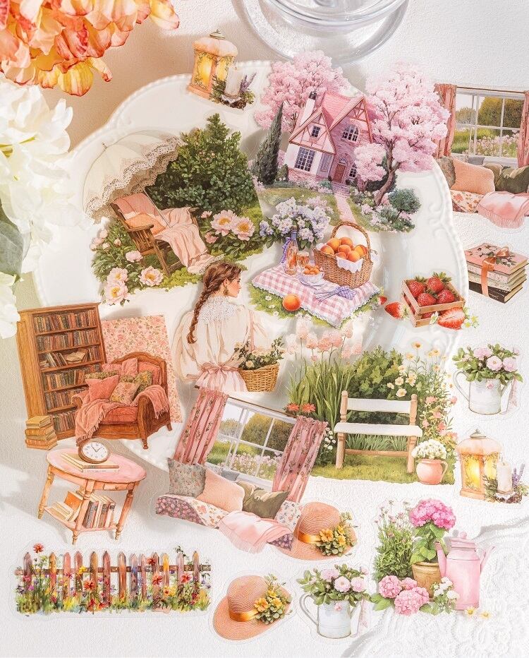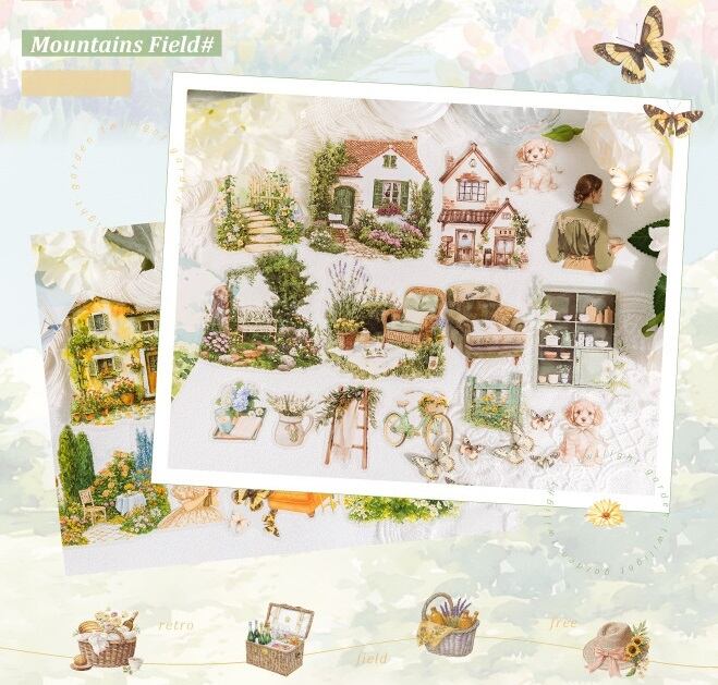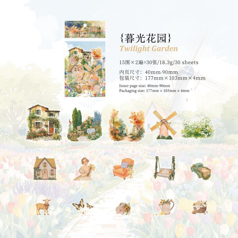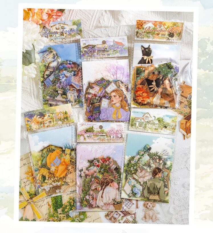 お洒落でレトロな町の風景が描かれたフレークシールです。眺めているだけで心を癒す水彩画スタイルの美しいデザインは、1枚でも存在感があり、お好きな場所に貼るだけで華やかな雰囲気を演出します。