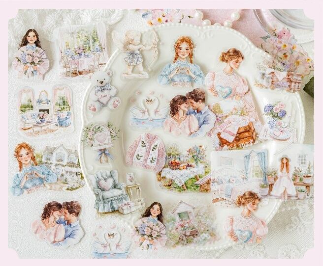 愛をテーマにしたフレークシールです。ロマンティックなデザインが手帳やノートを華やかに彩るだけでなく、ギフトのラッピングにもぴったりです。多様なスタイルを持つシールたちが、特別な魅力をプラスしてくれます。