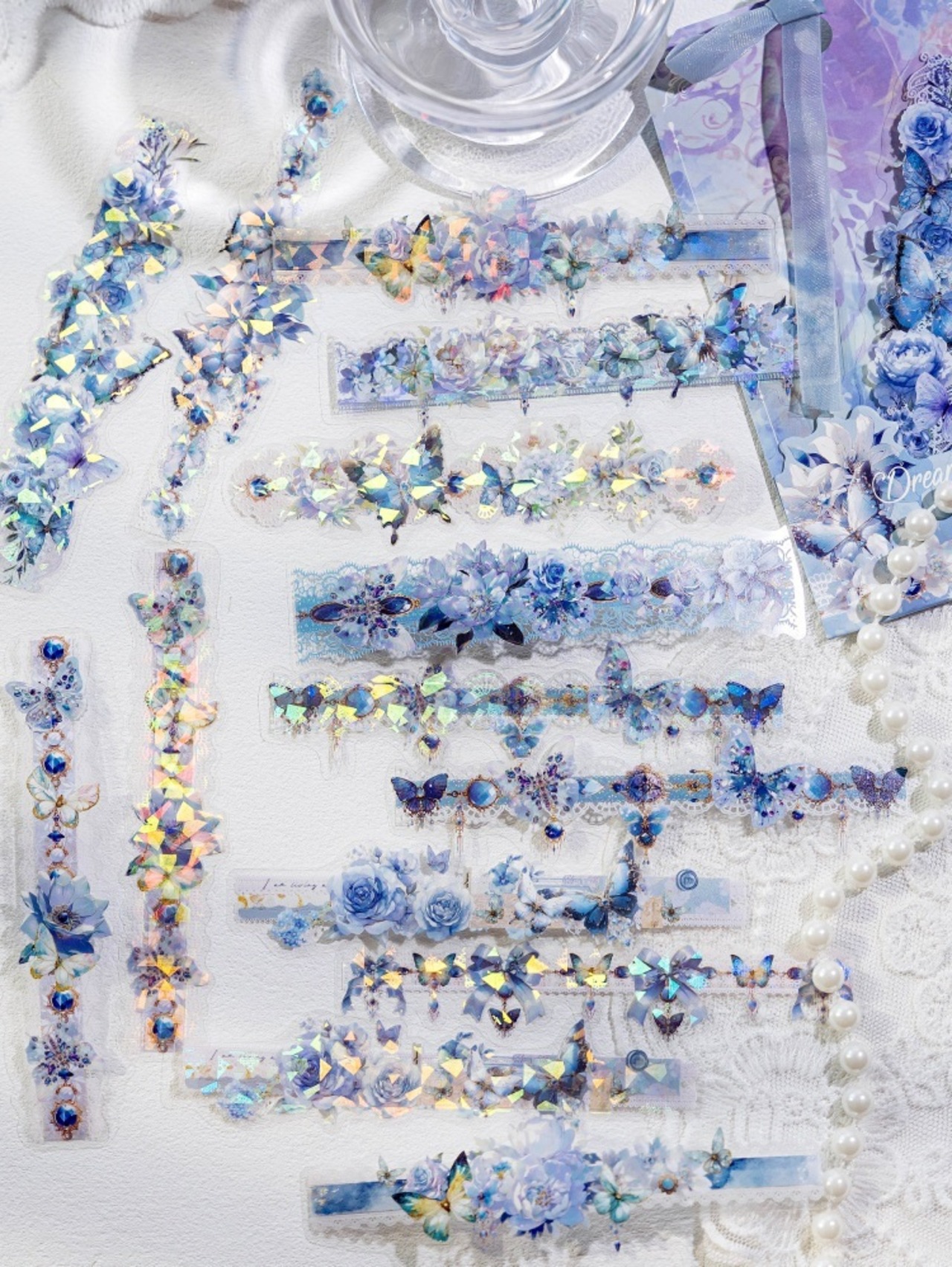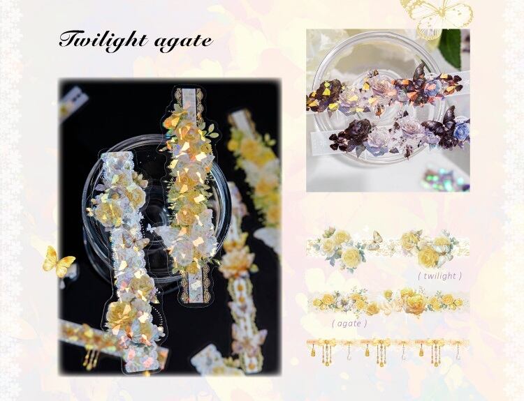 花と蝶、そしてレースの美しいデザインが特徴のシールです。手帳やノート、コラージュのアクセントにおすすめ。花の華やかさと蝶の優雅さ、レースの繊細さが融合したデザインは、さまざまな用途でご活用いただけます。