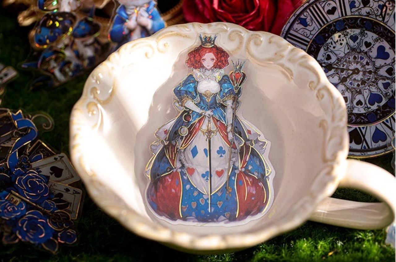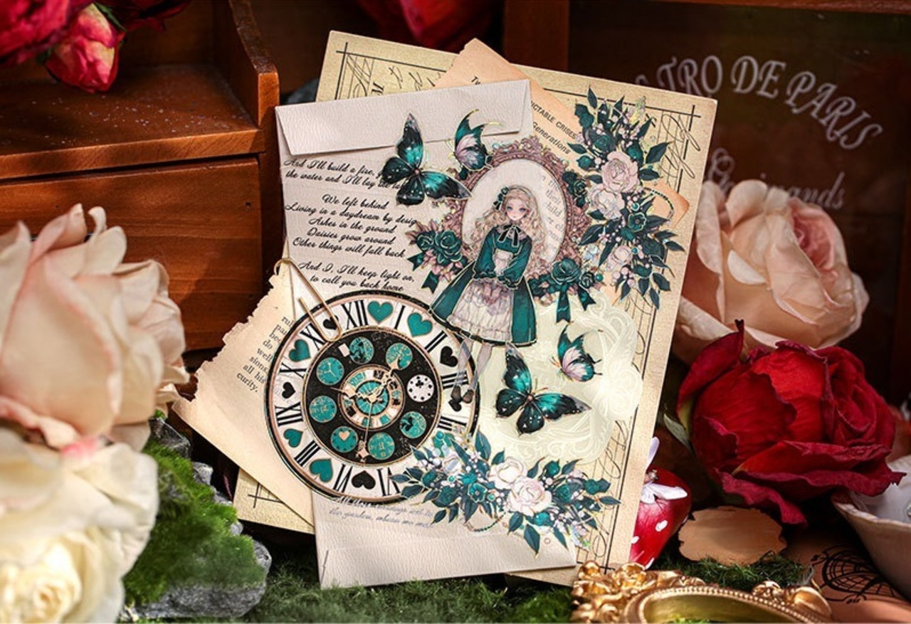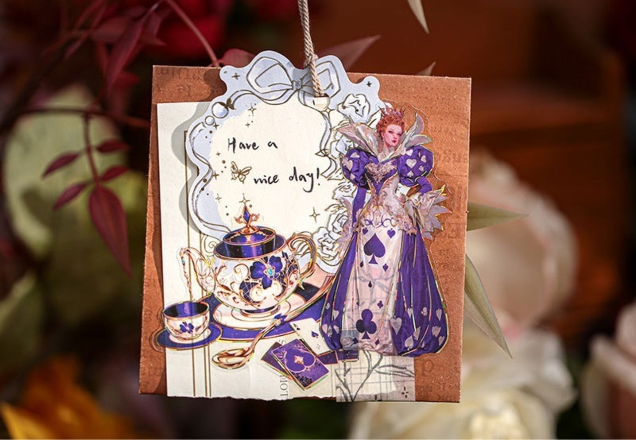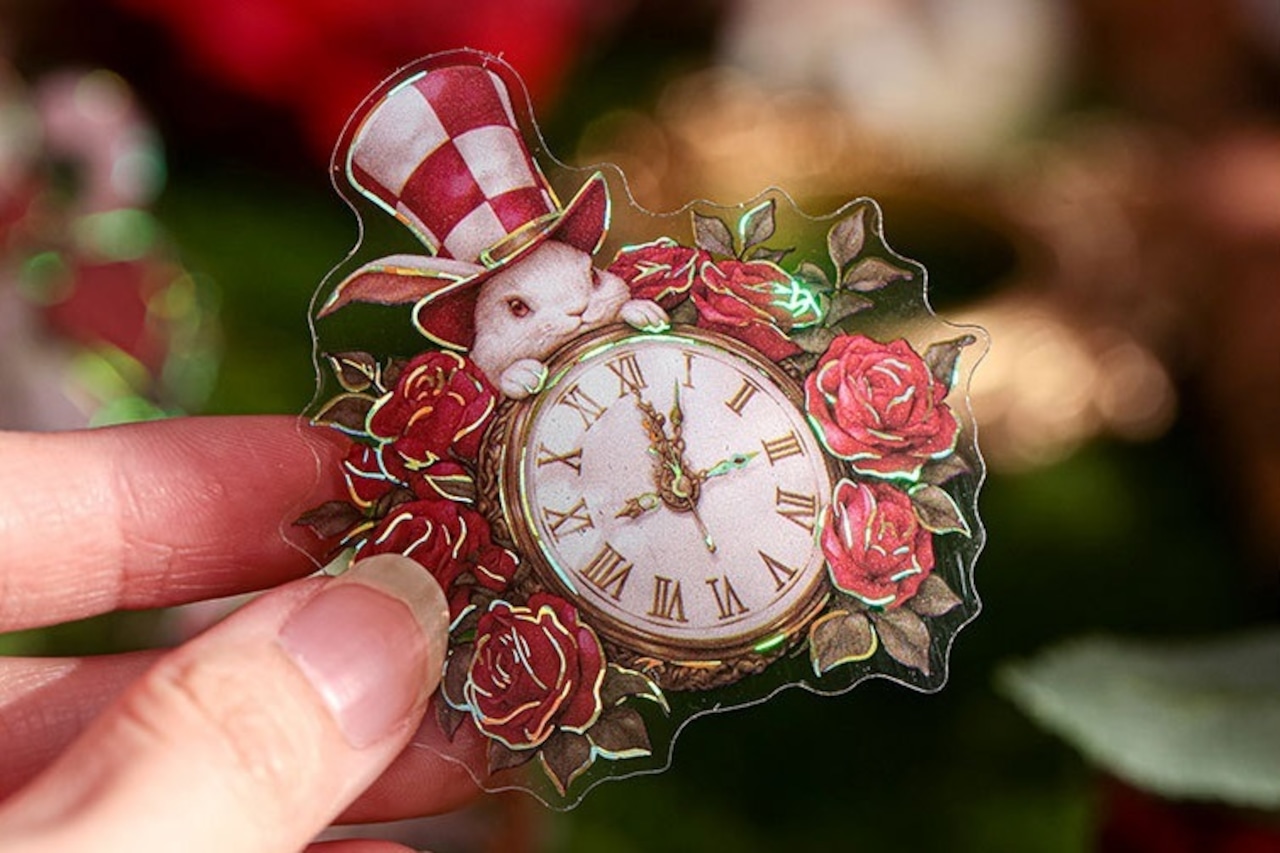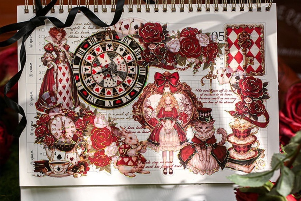 アリスの幻想的な世界観を表現したシールです。大きなサイズと個性的で色彩豊かなデザインは、どのシールも魅力的で存在感があり、コラージュのアクセントにおすすめです。