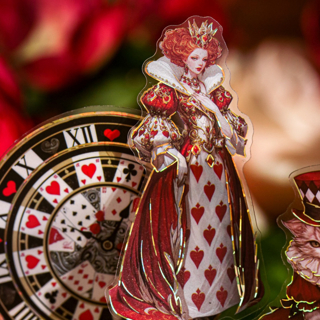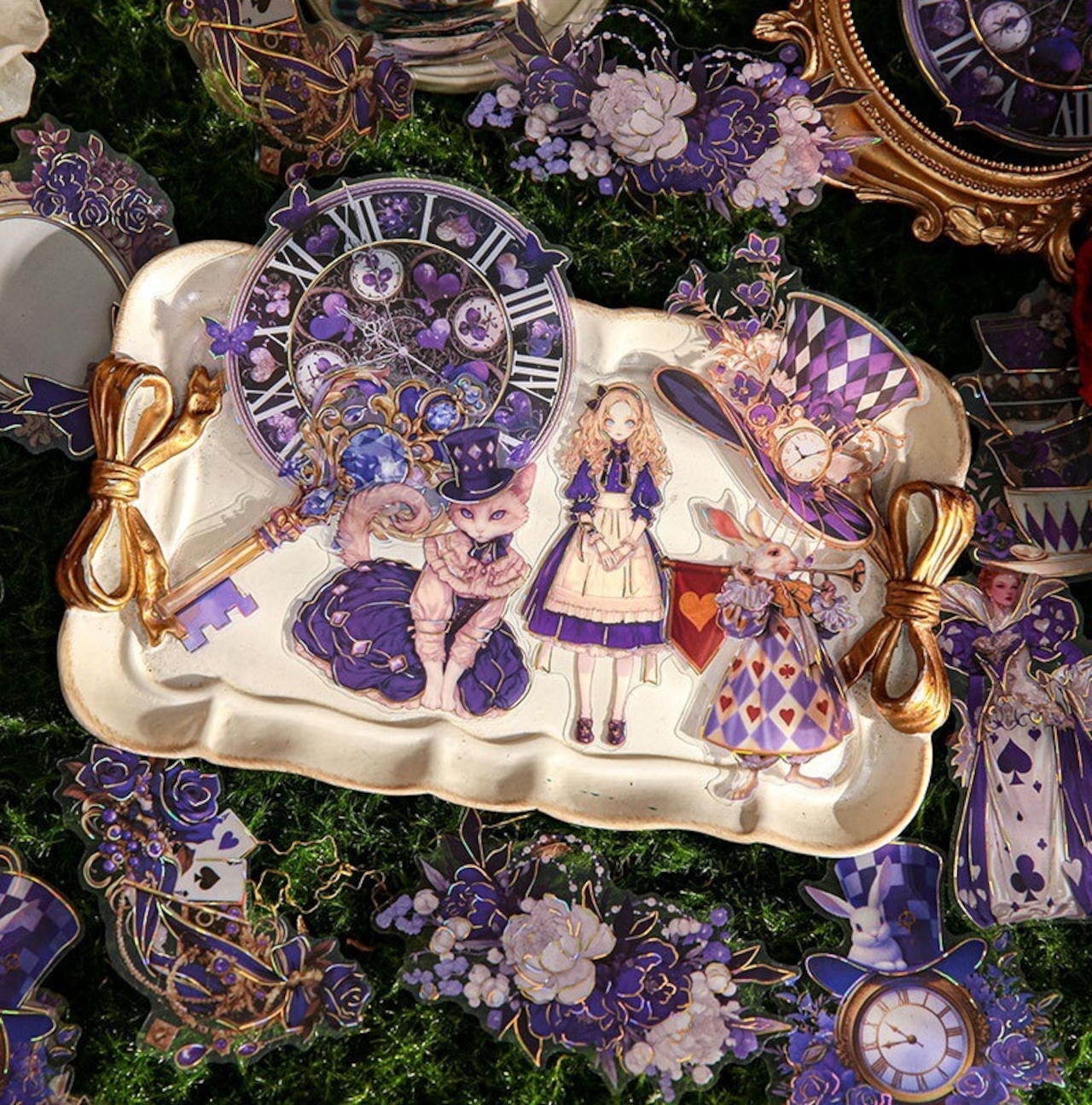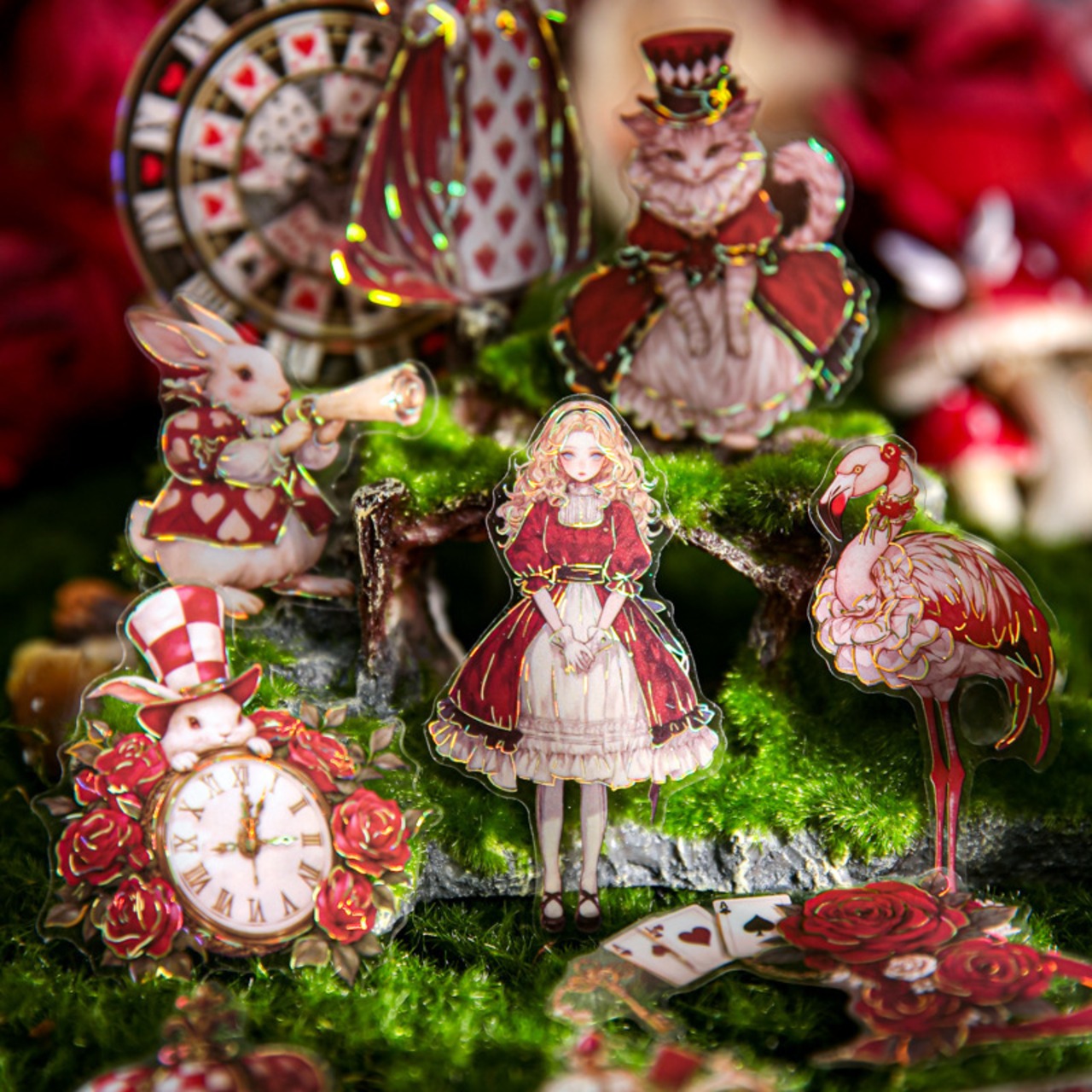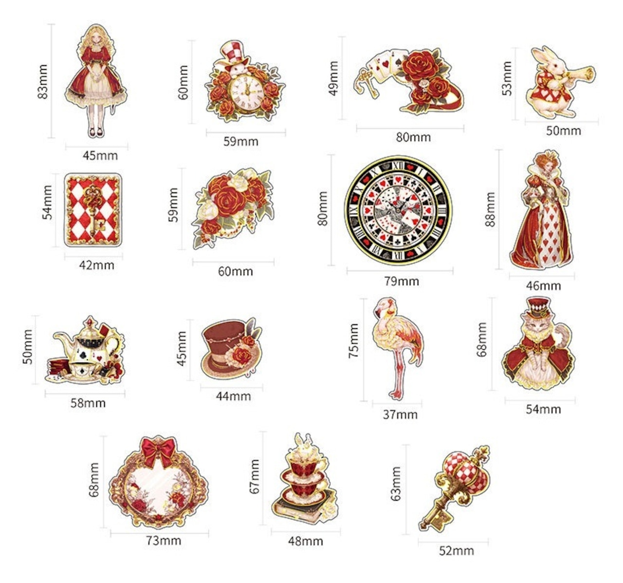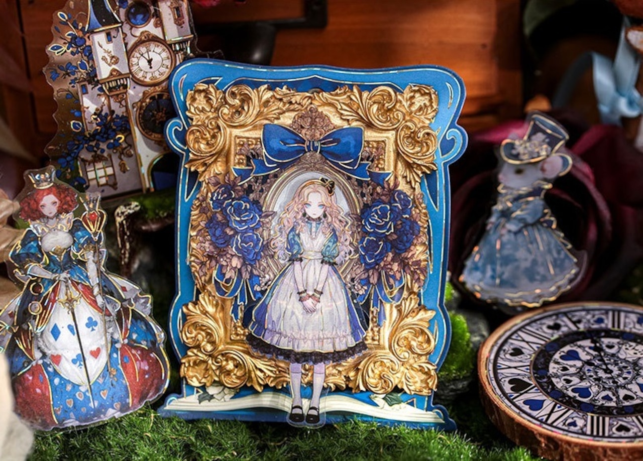 アリスの幻想的な世界観を表現したシールです。大きなサイズと個性的で色彩豊かなデザインは、どのシールも魅力的で存在感があり、コラージュのアクセントにおすすめです。