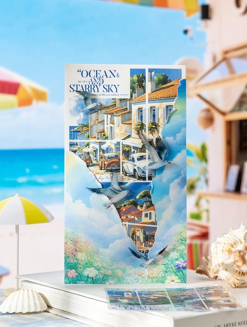 海辺の街並みやカフェ、花屋、夕暮れや夜の風景まで、さまざまな海のシーンを切り取ったシールブックです。鮮やかな青空や夕焼け、やわらかな光の表現が美しく、貼るだけで手帳デコやコラージュに奥行きとストーリーを加えてくれます。和紙とPETの異なる素材を組み合わせた仕様で、マットな質感と透明感の両方を楽しめるのが魅力です。シールブックタイプで整理しやすく、ページごとに異なるデザインがまとまっているため、使いたい場面に合わせて選びやすくなっています。手帳デコ、コラージュ素材、シールブック、海外シール、風景シール、海デザイン、ジャーナル、ノートアレンジに幅広く活用でき、海やリゾート、カフェ風デザインが好きな方におすすめの商品です。