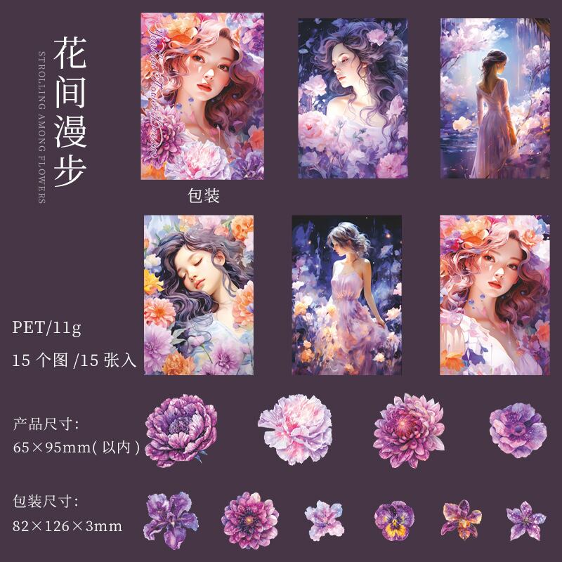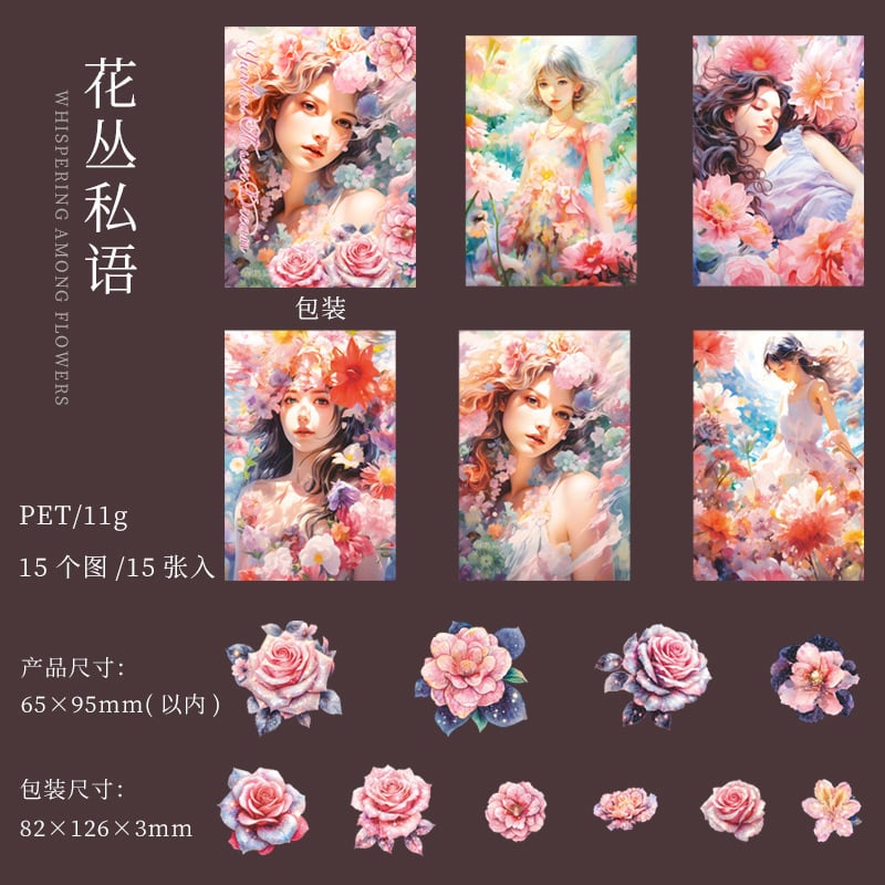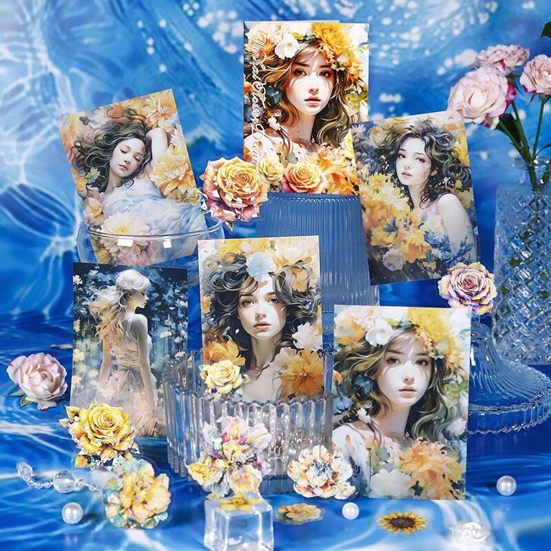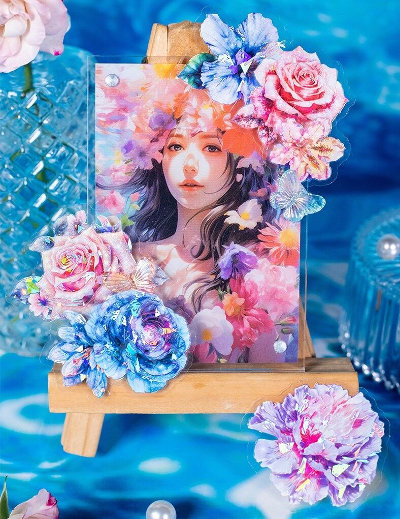美しい少女と花々が描かれたシールです。鮮やかな色使いと繊細なディテールで、コラージュに華やかさとロマンティックな雰囲気をプラスしてくれます。