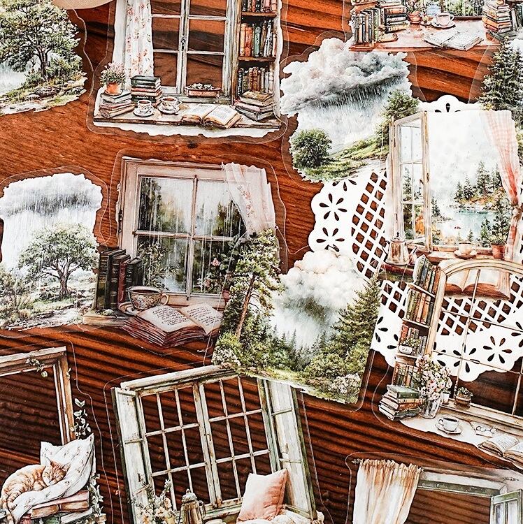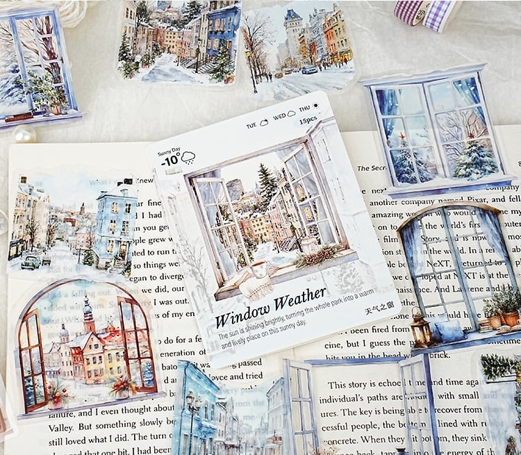 季節や天候によって移り変わる様々な窓辺の風景が、繊細なイラストで描かれているシールです。PET素材なので貼る場所の背景色を選ぶことなく、重ね貼りをして奥行きのあるコラージュ表現をすることも可能です。いつものノートや手帳、ジャンクジャーナルに美しい窓の外の風景をプラスしてお楽しみください。
