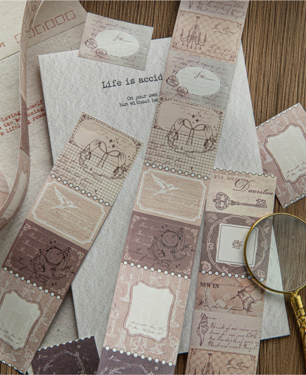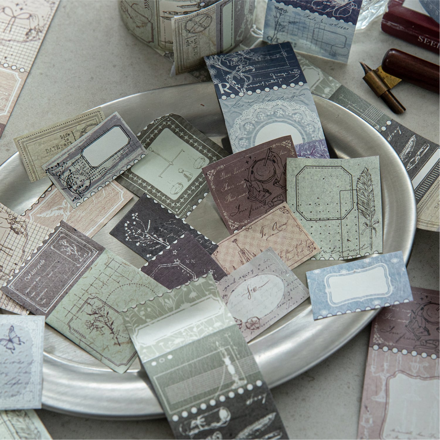 上品なアンティーク調デザインのシールです。ロールシールタイプなのでカットをする手間もなく、手軽にお使いいただけます。素材紙やマスキングテープなどと重ねて貼ることで、お洒落なコラージュに仕上がります。ラッピングにもおすすめです。
