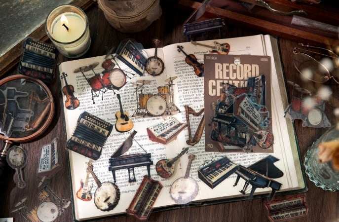 懐かしいレコードジャケットを彷彿とさせるアーティスティックなデザインのシールです。楽器、クラシックカー、アンティークな日用品が詰め込まれたノスタルジックな世界観をお楽しみいただけます。ジャンクジャーナル、スクラップブッキングなどにおすすめです。
