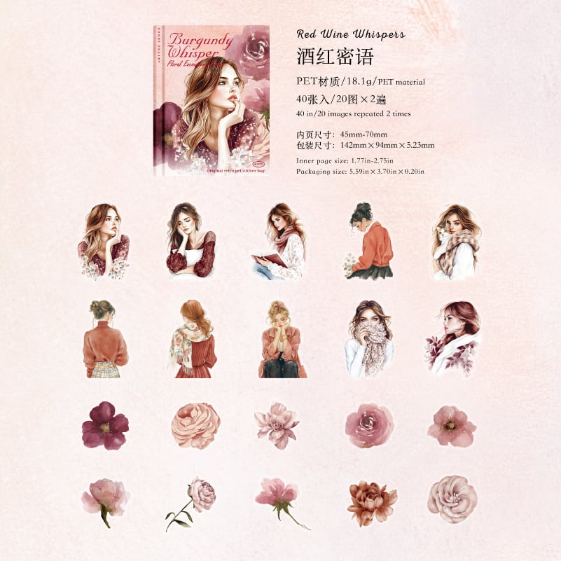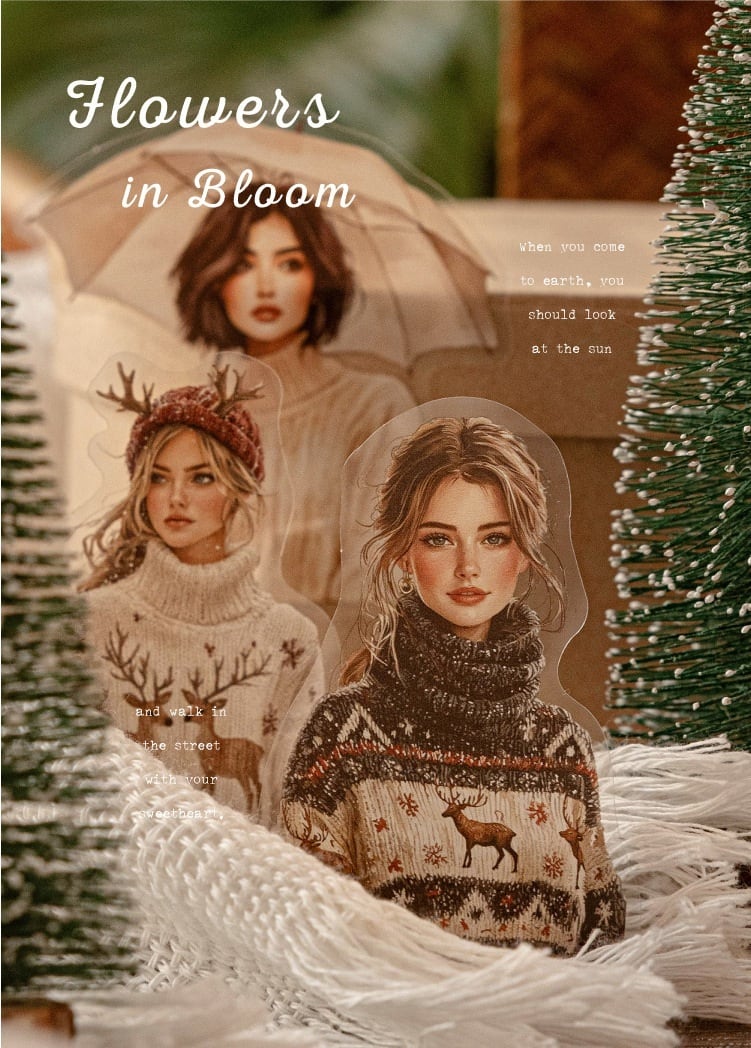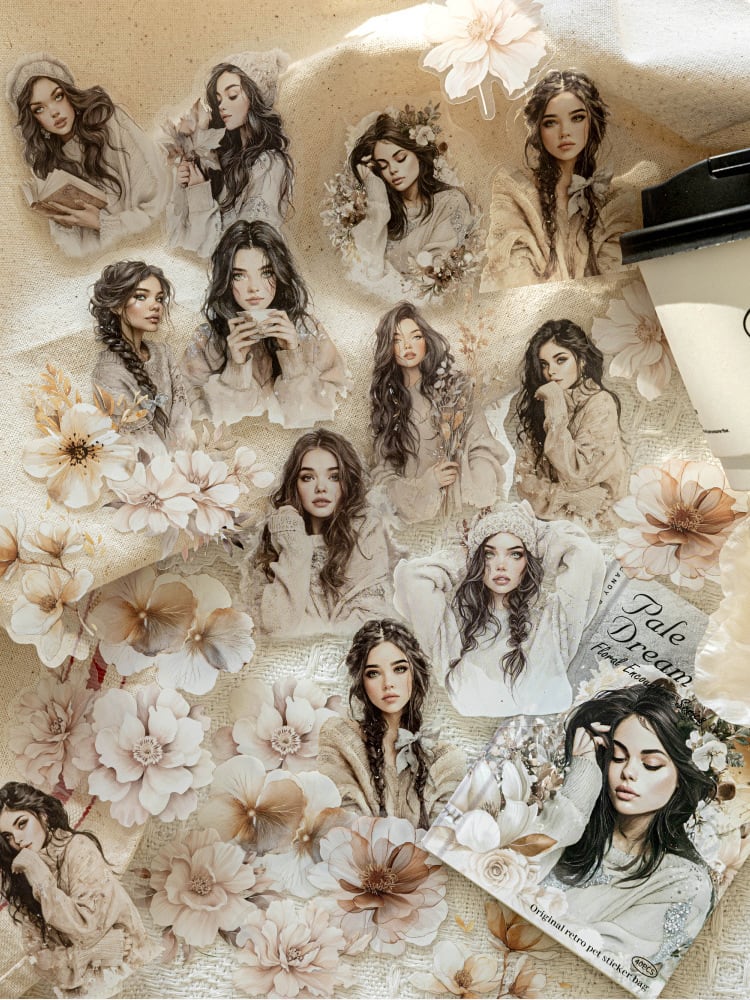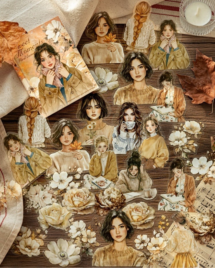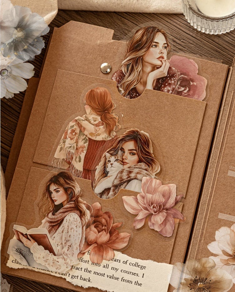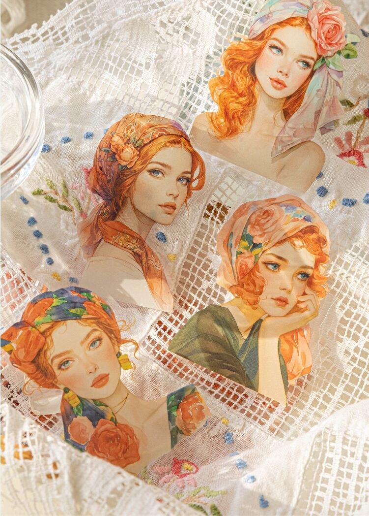 洗練された大人の女性デザイン人物ステッカーです。繊細なタッチと、ノスタルジックで落ち着いた色合いが魅力で、子供っぽくない上品なクラフト素材をお探しの方に最適です。手帳やノートをエレガントにデコレーションしたり、ジャンクジャーナルや特別な手紙のアクセントとして、日常に上質な彩りを加えてみてはいかがでしょうか。