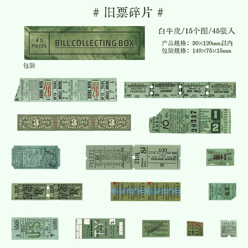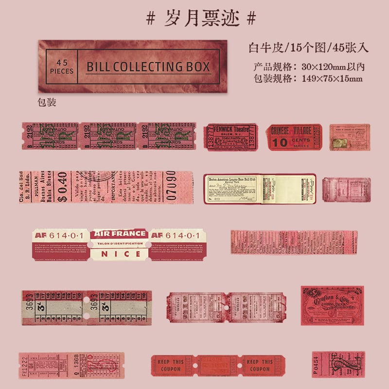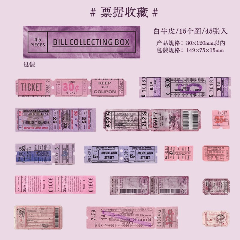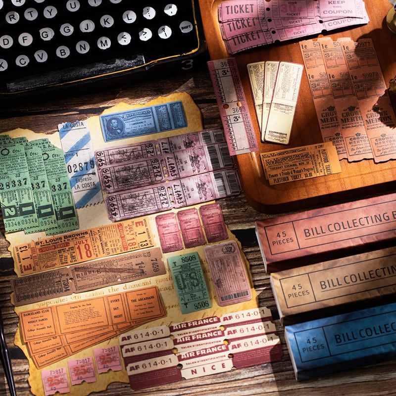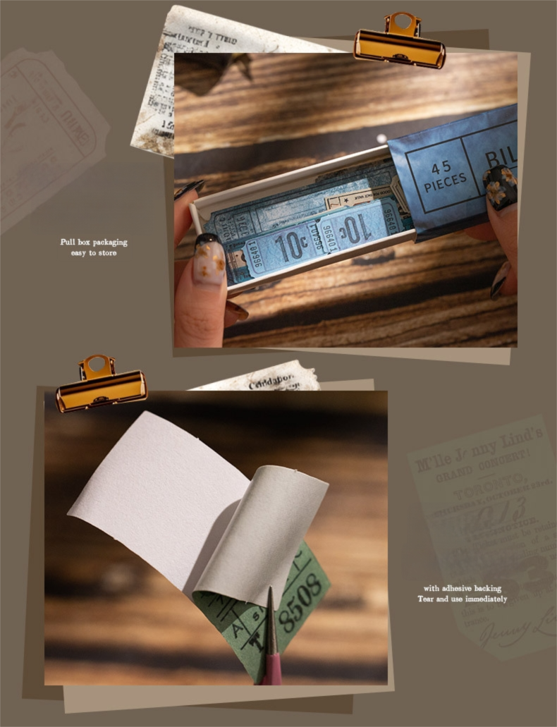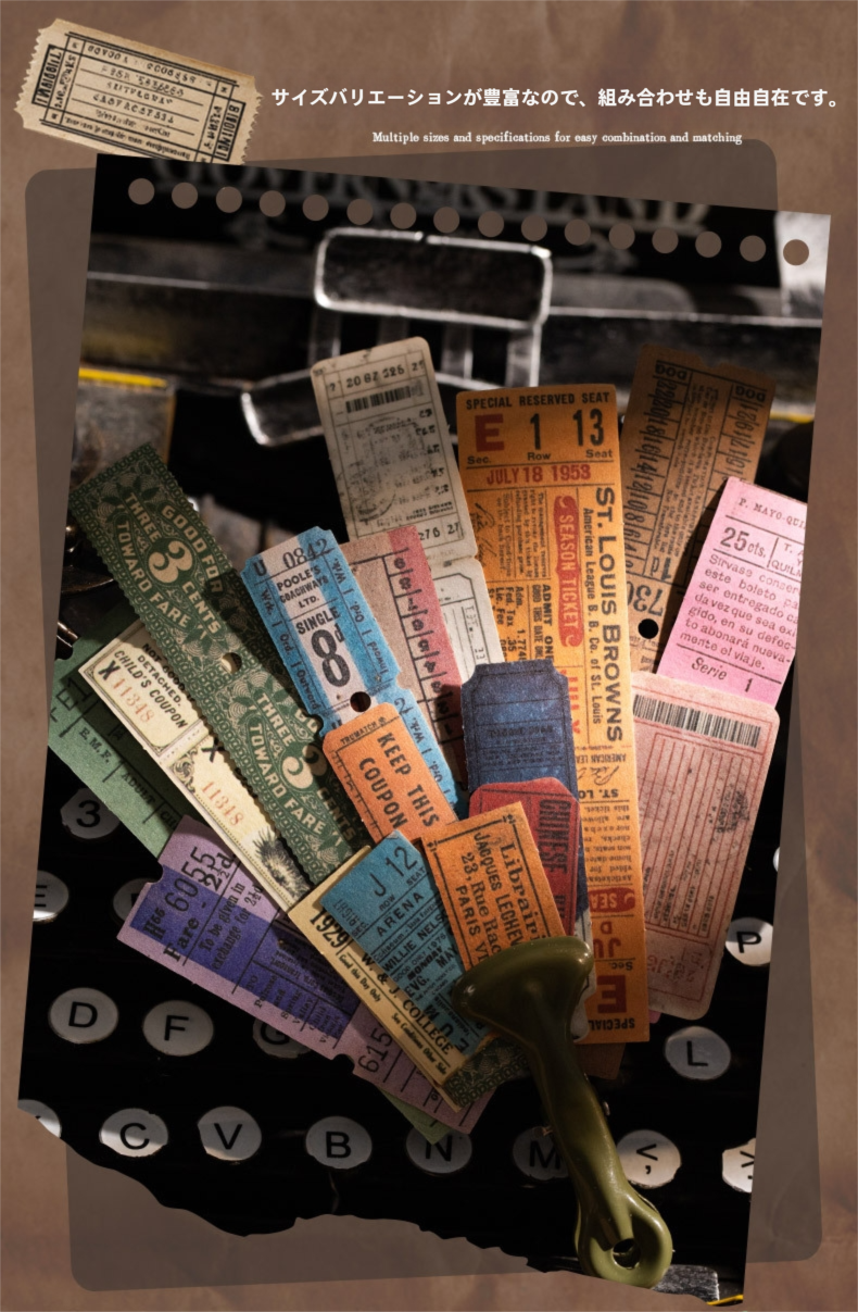海外のチケットをイメージしたノスタルジックでレトロなデザインが特徴のシールです。まるで本物の切符や領収書のような風合いを持つカラフルで個性豊かなデザインの素材が45枚もボックスにたっぷり詰まっており、使いやすい細長い形状は手帳の余白やページの端を彩るのにも最適です。スクラップブッキングやオリジナルのカード作成、自由な発想でのペーパークラフトなどに幅広く活用でき、パッケージの箱自体もシンプルでお洒落なので、使い終わった後も小物入れとしてお使いいただけます。