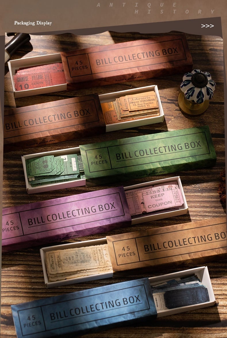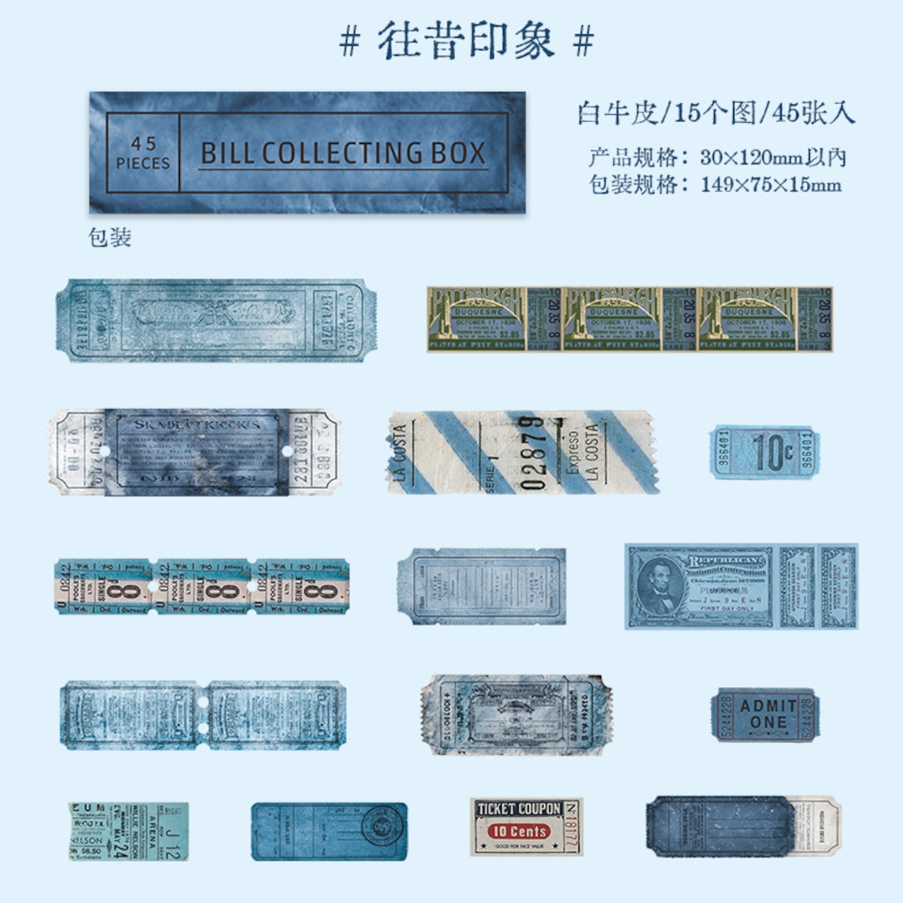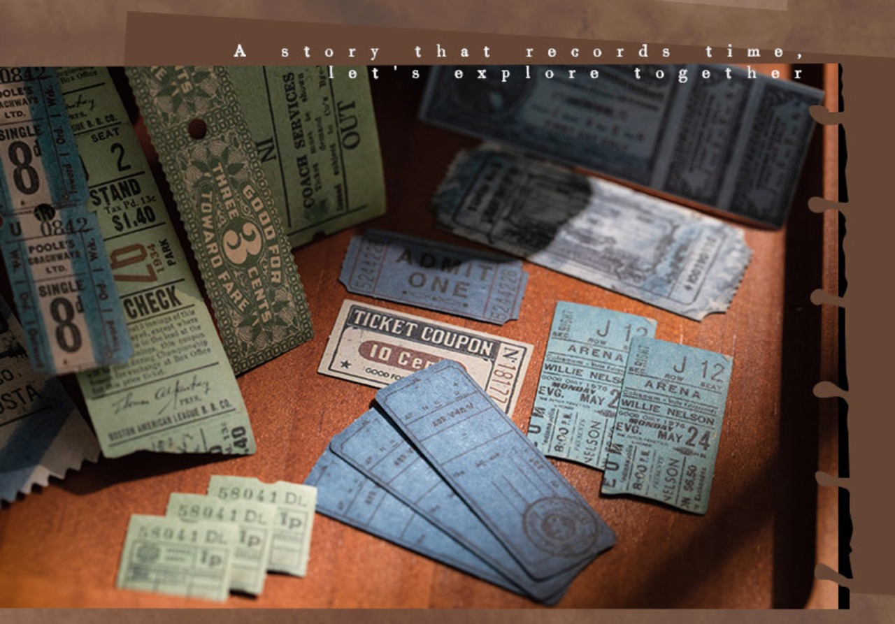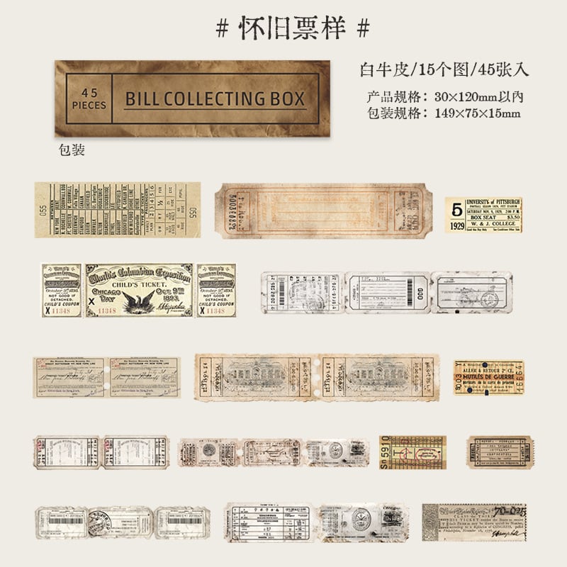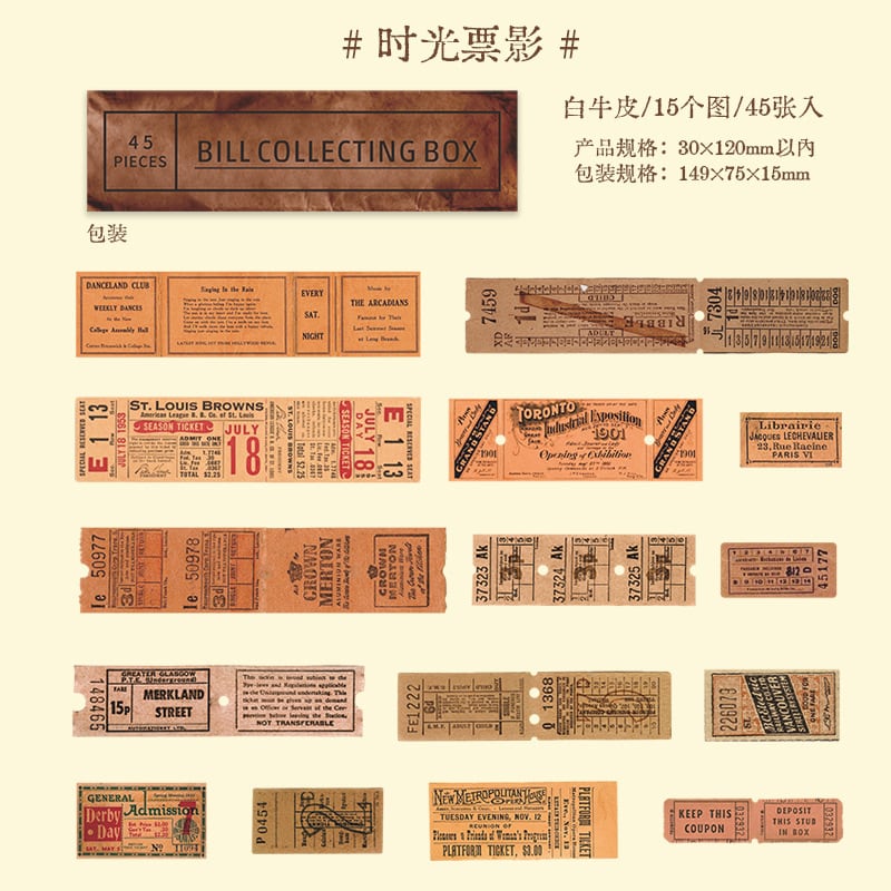 海外のチケットをイメージしたノスタルジックでレトロなデザインが特徴のシールです。まるで本物の切符や領収書のような風合いを持つカラフルで個性豊かなデザインの素材が45枚もボックスにたっぷり詰まっており、使いやすい細長い形状は手帳の余白やページの端を彩るのにも最適です。スクラップブッキングやオリジナルのカード作成、自由な発想でのペーパークラフトなどに幅広く活用でき、パッケージの箱自体もシンプルでお洒落なので、使い終わった後も小物入れとしてお使いいただけます。