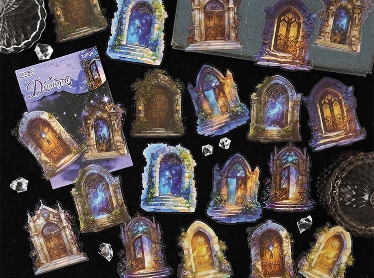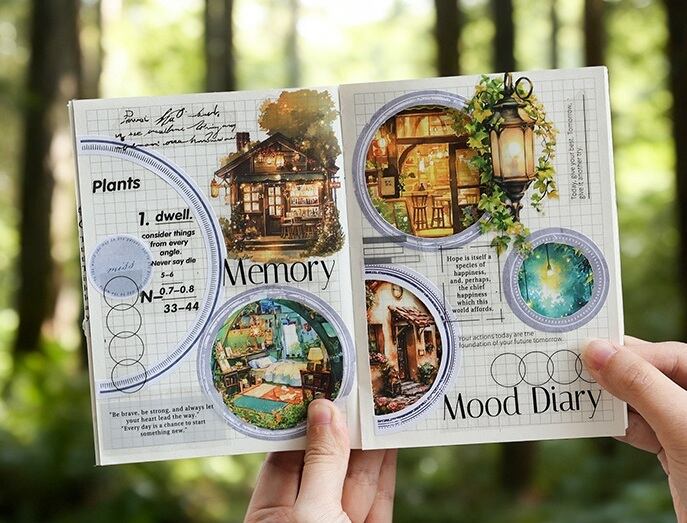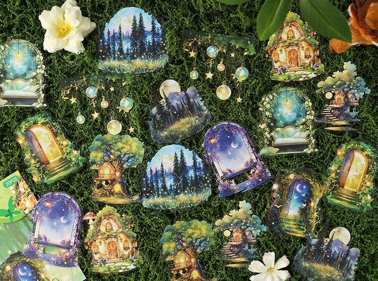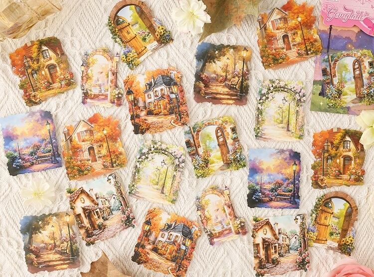 まるで旅の途中で出会った小さな物語のかけらのような、あたたかな灯りに包まれた家々や、静かな夜の書斎、物語が始まりそうな窓辺の風景が描かれた幻想的なPETシールです。やわらかな色合いと、絵本のような世界観が魅力。PET素材ならではのほどよい透け感があり、重ね貼りしても雰囲気を損なわず、ページに自然となじみます。