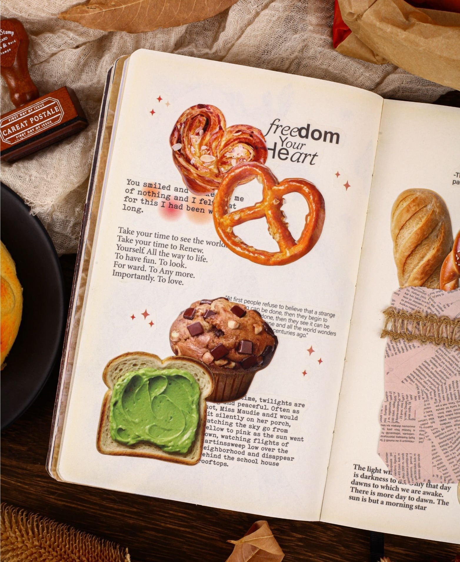 パン屋さんをテーマにしたコラージュ素材セットです。クロワッサンやプレッツェル、焼き菓子など、ベーカリーをモチーフにしたイラストを中心に、あたたかみのあるレトロな雰囲気に仕上げられています。落ち着いた色合いで、手帳デコやコラージュに取り入れやすく、ページ全体にやさしいアクセントを加えてくれます。シール部分には硬質ペーパー素材を使用しており、しっかりとした質感で貼った際の存在感もあります。素材紙と組み合わせて使うことで、ジャンクジャーナルやスクラップブッキング、ラッピング装飾など、幅広いアレンジをお楽しみいただけます。海外紙ものやベーカリー・スイーツモチーフがお好きな方におすすめの素材セットです。