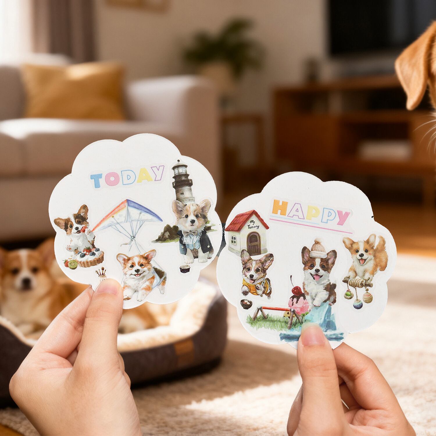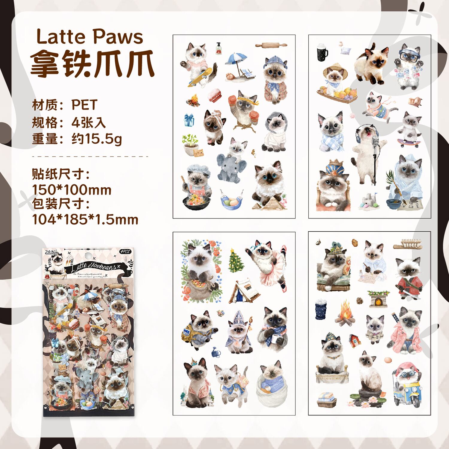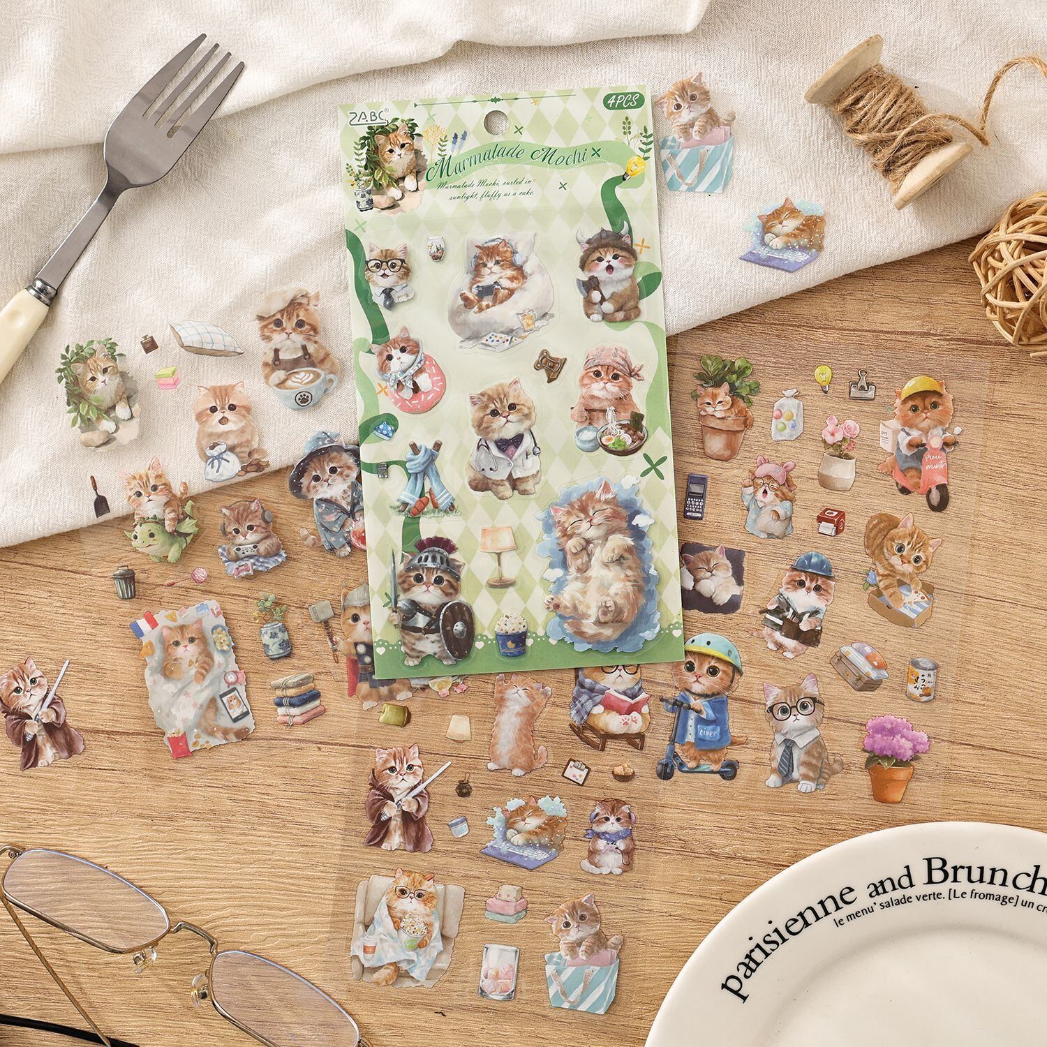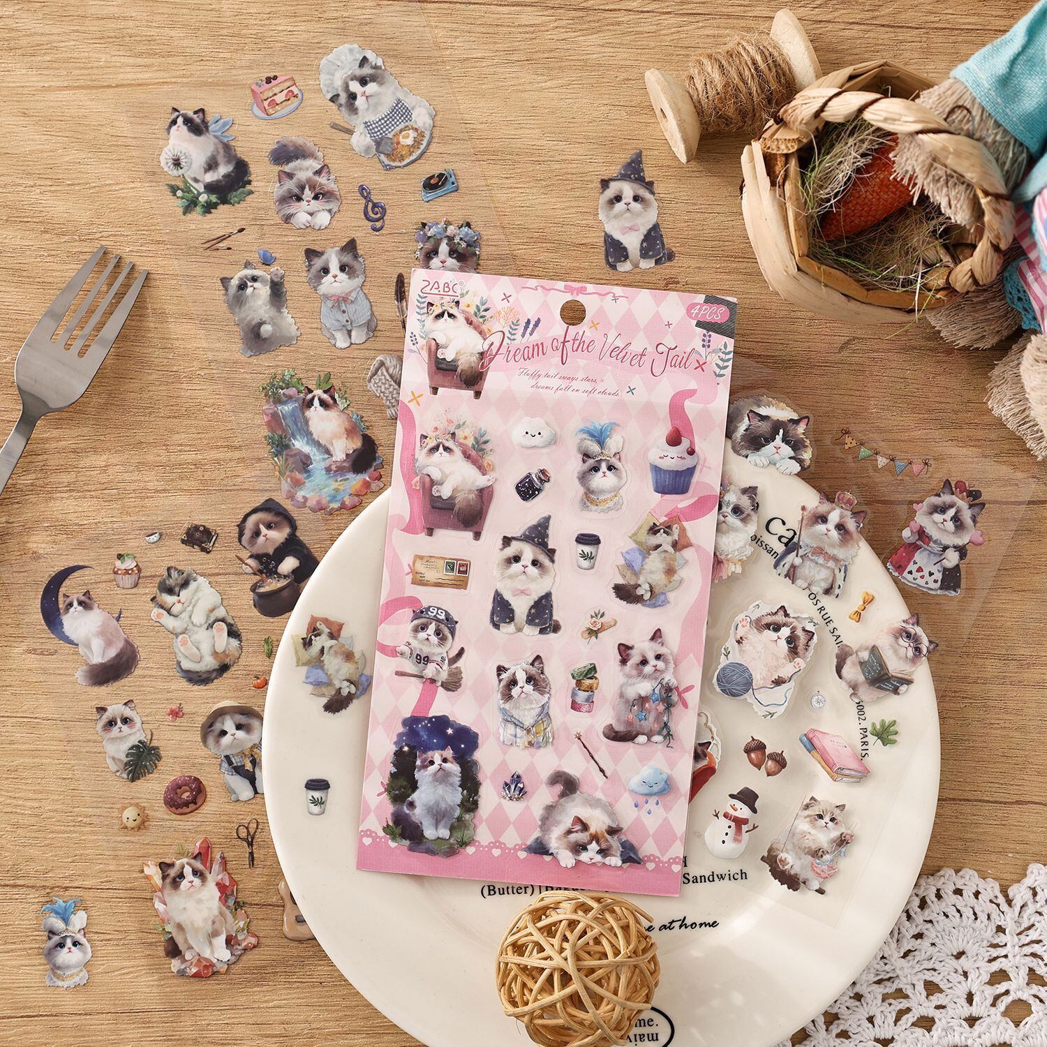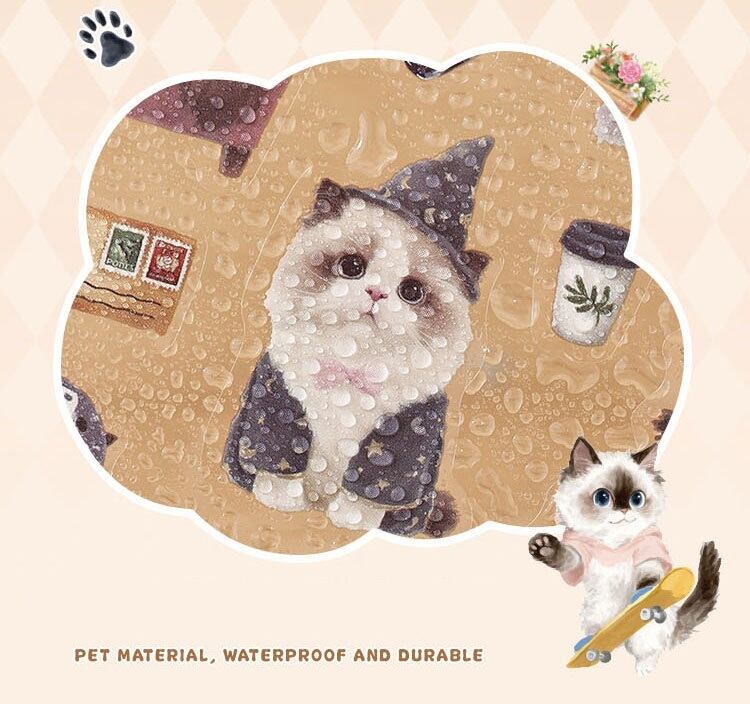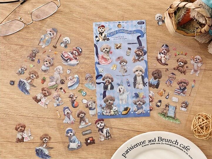 愛らしい動物たちの日常を描いたPETシールです。 猫や犬を中心に、暮らしのワンシーンや小物と組み合わさったデザインが揃っており、見ているだけでも物語を感じられるセットになっています。やわらかな色合いと繊細なタッチで描かれているため、コラージュや手帳デコに取り入れると、ページ全体にやさしく温かな雰囲気を添えてくれます。PET素材のため、紙ものと重ね貼りしても重たくなりすぎず、他の素材ともバランスよく組み合わせやすいのも魅力です。手帳デコやジャンクジャーナル、スクラップブッキングなど、日常の記録や世界観づくりにそっと寄り添ってくれるシールです。 動物モチーフがお好きな方や、やさしい雰囲気のコラージュを楽しみたい方におすすめです。