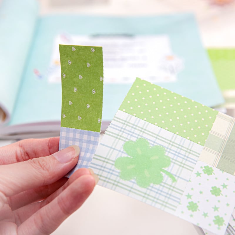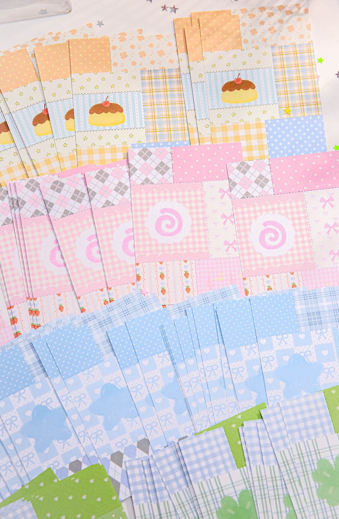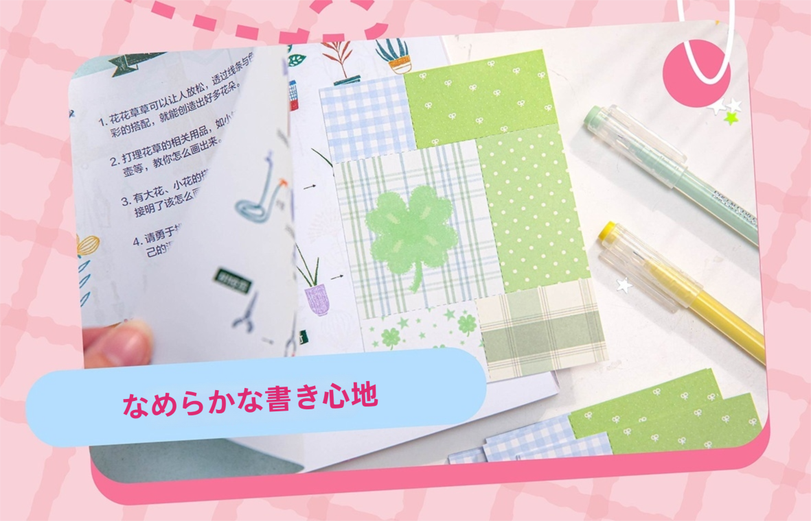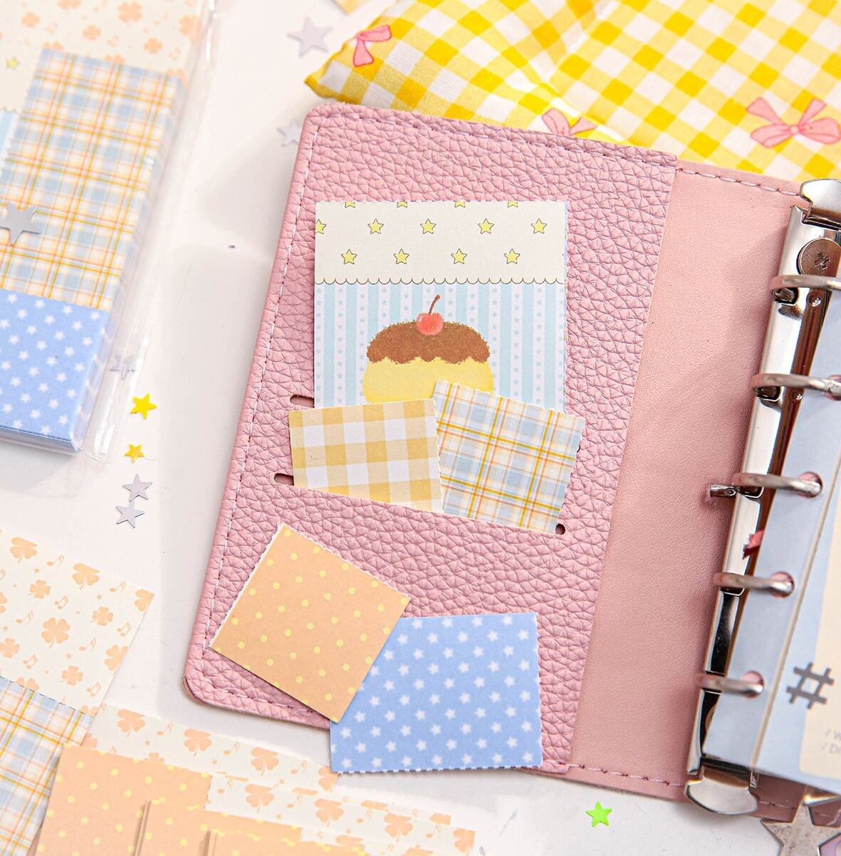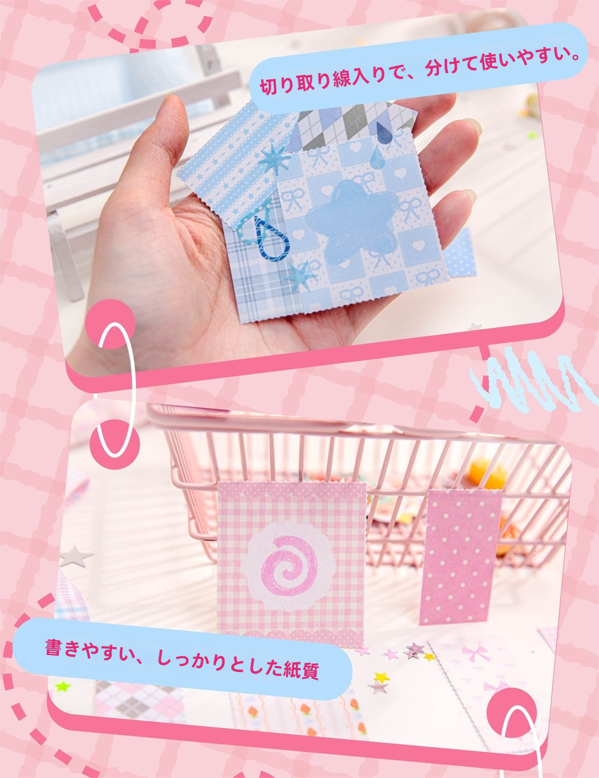 やわらかな淡色と、パッチワークのように組み合わされたデザインが可愛いメモです。スイーツを思わせるデザインやチェック柄、星など、甘さのあるモチーフがやさしい色合いで描かれており、見ているだけでも穏やかな気持ちになるような世界観が広がります。主張しすぎないデザインのため、手帳やノートに取り入れてもなじみやすく、ページ全体をやわらかくまとめてくれます。日々のメモや予定の書き留めはもちろん、手帳デコレーションやコラージュのアクセントとしても使いやすく、淡色系や韓国風テイストがお好きな方にもおすすめです。