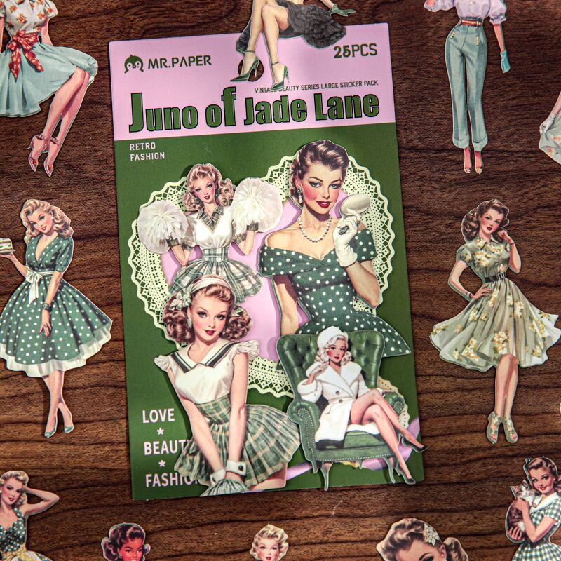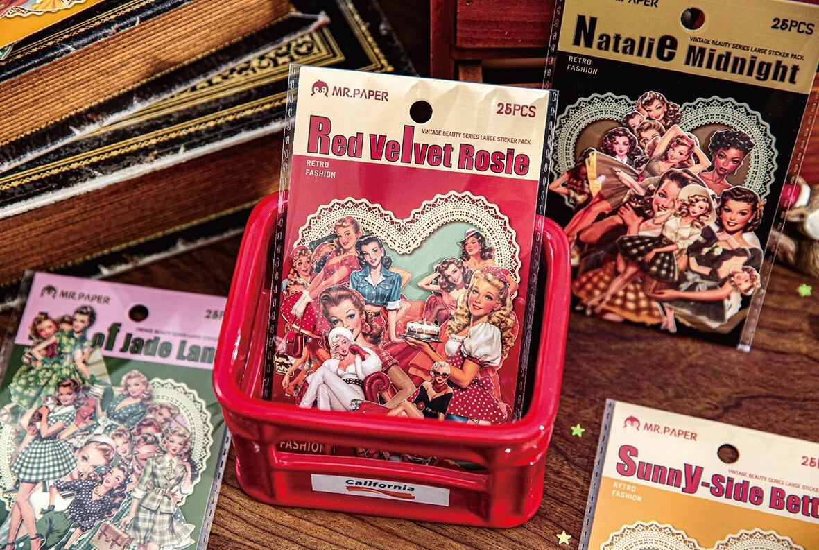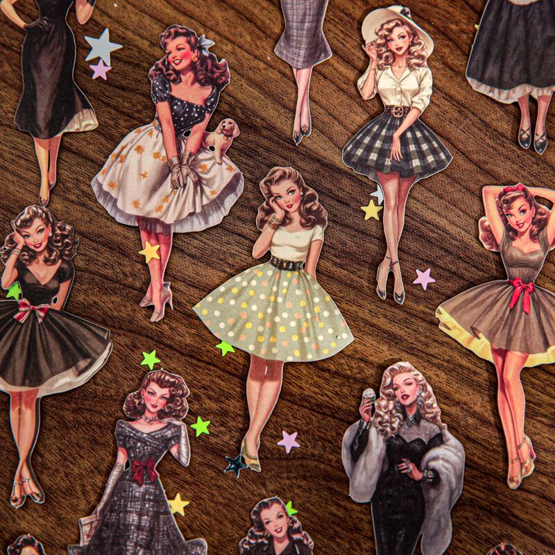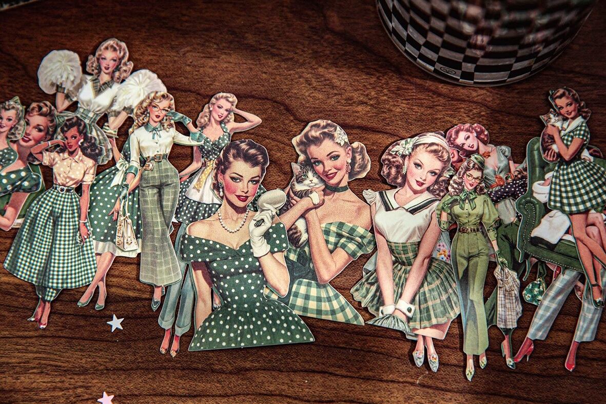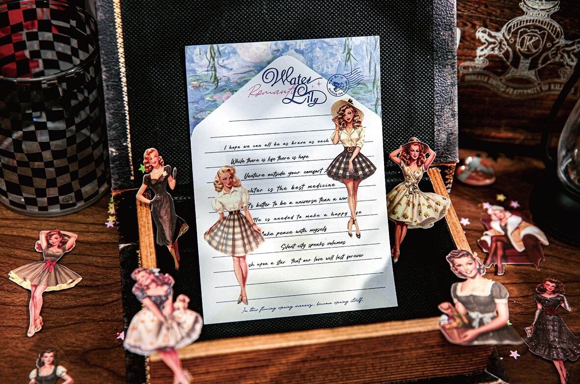 海外文具の人物モチーフをお探しの方にも取り入れやすい、クラシカルなファッションや日常のワンシーンを切り取ったような、ヴィンテージデザインのシールです。少し色あせたような色合いや、落ち着いたイラストの表情が、コラージュや手帳デコに自然と馴染み、ページ全体に物語性を添えてくれます。コラージュ素材としても使いやすく、人物モチーフでありながら主張しすぎず、他のシールや素材とも組み合わせやすいデザインです。重ね貼りや配置次第で、落ち着いた雰囲気のページづくりを楽しめます。