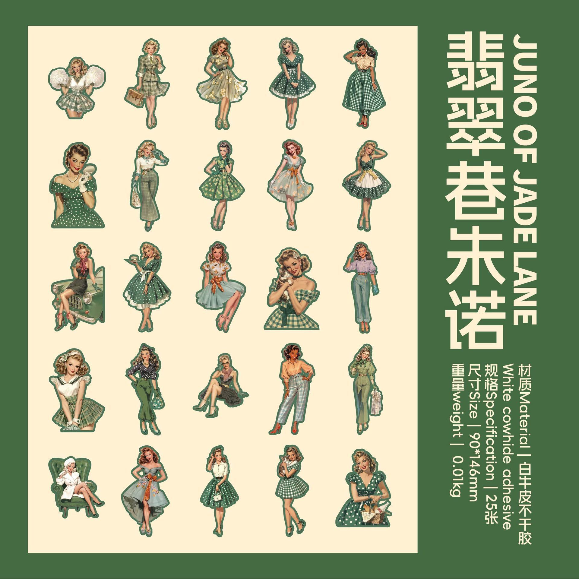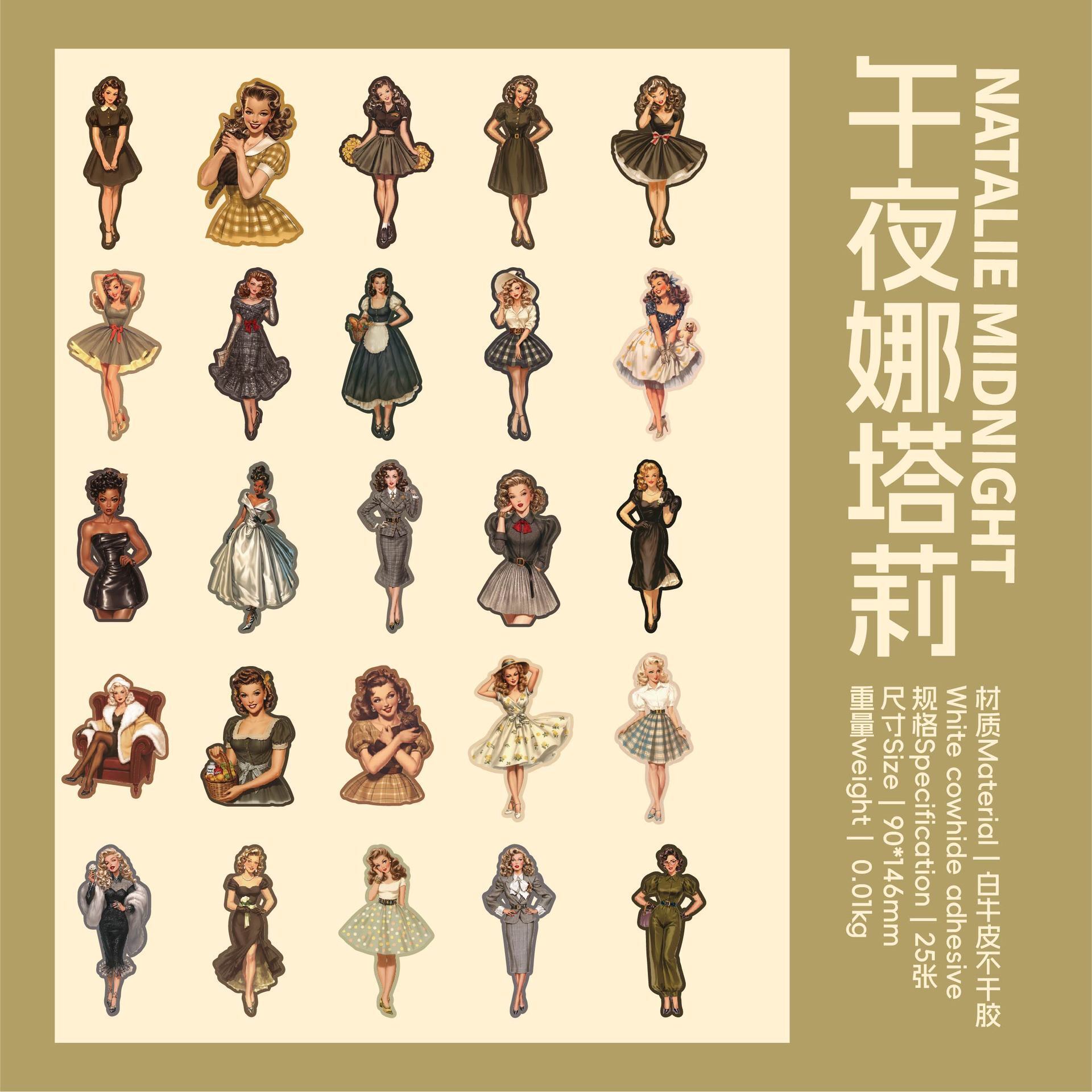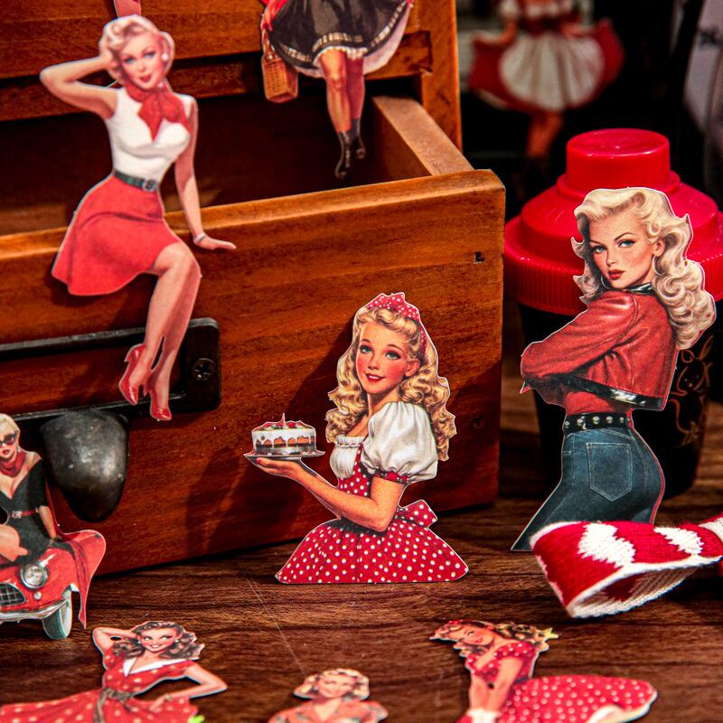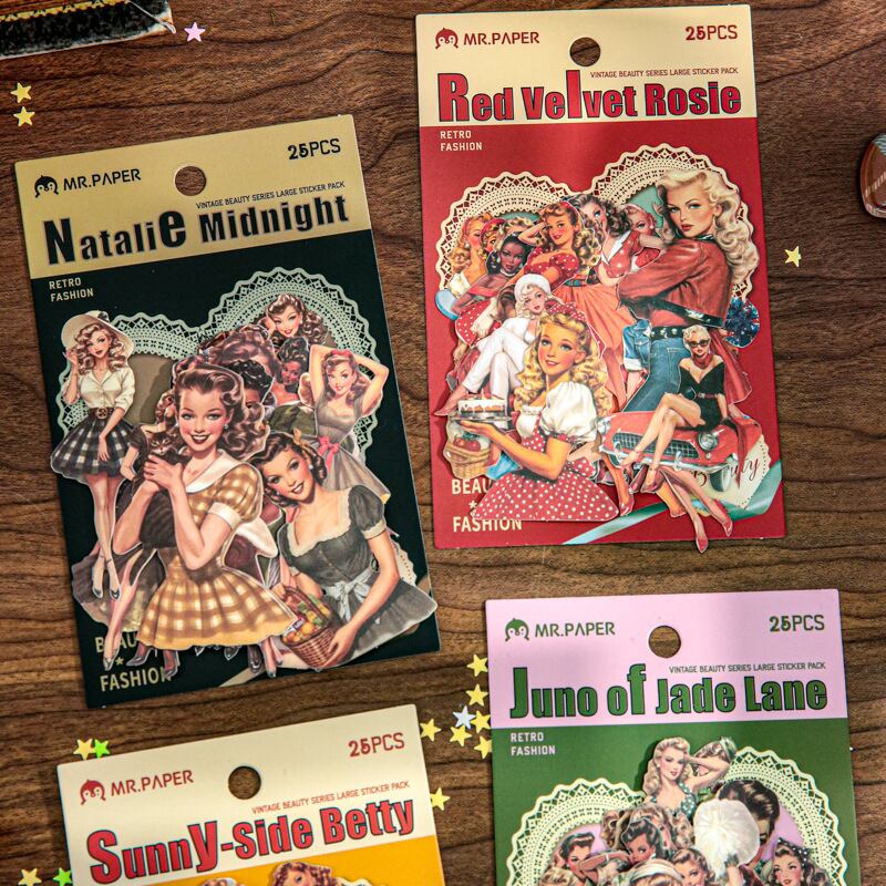 海外文具の人物モチーフをお探しの方にも取り入れやすい、クラシカルなファッションや日常のワンシーンを切り取ったような、ヴィンテージデザインのシールです。少し色あせたような色合いや、落ち着いたイラストの表情が、コラージュや手帳デコに自然と馴染み、ページ全体に物語性を添えてくれます。コラージュ素材としても使いやすく、人物モチーフでありながら主張しすぎず、他のシールや素材とも組み合わせやすいデザインです。重ね貼りや配置次第で、落ち着いた雰囲気のページづくりを楽しめます。