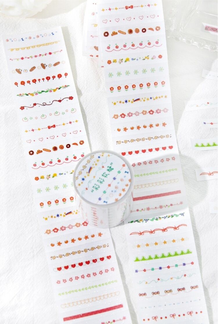 やさしい色合いのライン柄が連なるロールタイプのシールです。繊細で可愛らしいデザインなので、手帳デコやコラージュ素材として使いやすく、日記やノート、ラッピングの装飾にも自然になじみます。合成紙素材ならではのなめらかな質感で、貼るだけでページがふんわりと明るい雰囲気になります。デザインごとにあらかじめカットされているため、そのまま使いやすく、余白デコや仕切りとしても取り入れやすい仕様です。手帳シールやラインシールをお探しの方、海外文具、コラージュ素材、紙ものが好きな方におすすめの商品です。