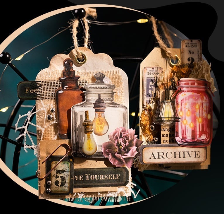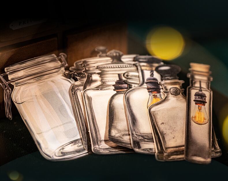 ガラス瓶やランプ、電球をモチーフにした、灯りの雰囲気を楽しめるシールです。透明感のある瓶の中にやさしい光を閉じ込めたようなデザインは、ページに静かなあたたかさと奥行きを添えてくれます。白牛皮紙とPETを組み合わせた素材は、ほどよいハリと軽やかさがあり、コラージュや手帳デコ、ジャンクジャーナルにも自然になじむ仕上がりです。主張しすぎない色合いと繊細な描写で、他のシールや紙ものとも合わせやすく、夜の雰囲気や落ち着いた世界観づくりに取り入れやすい商品です。
