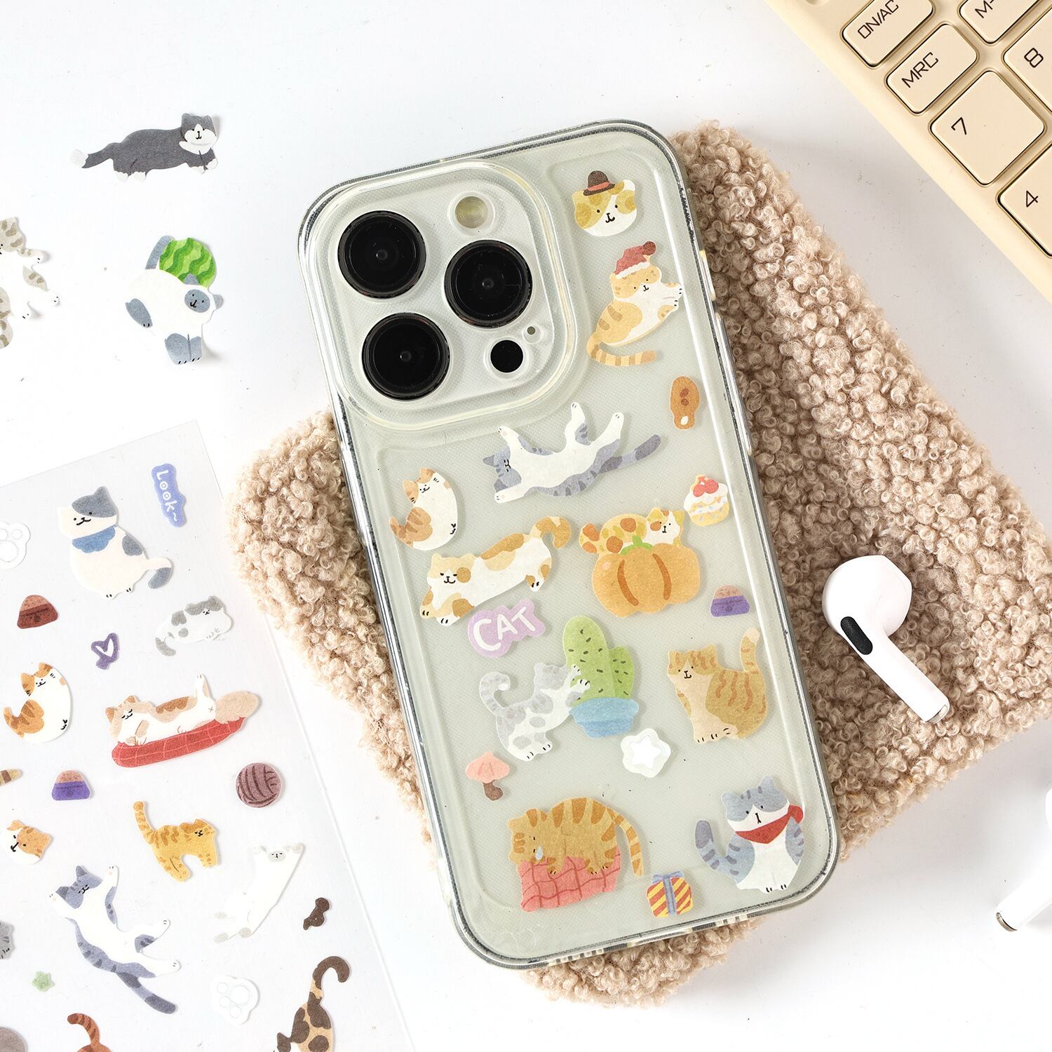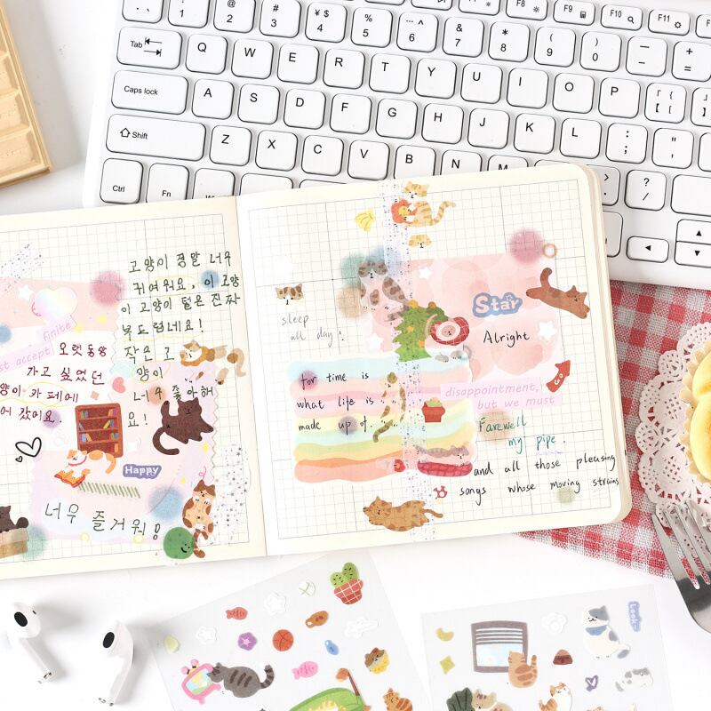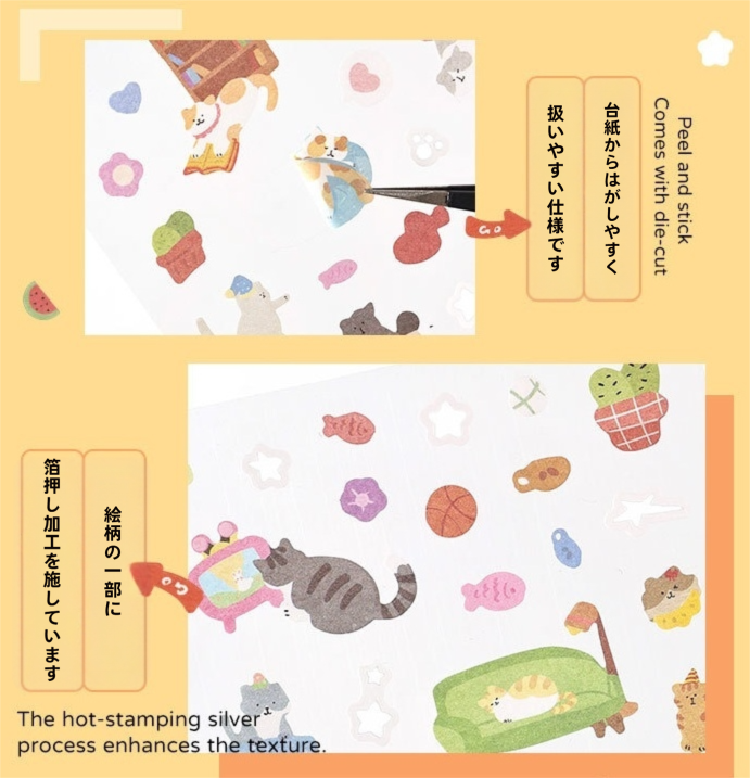 やわらかなタッチで描かれた猫たちをたっぷり詰め込んだ、和紙素材のシートシールです。くつろぐ姿や遊ぶ様子など、表情豊かなイラストが1枚のシートにバランスよく収められており、手帳デコやコラージュ、ノートアレンジに取り入れやすいデザインにまとめられています。和紙ならではのやさしい質感と、さりげない箔押し加工がほどよいアクセントになり、ページ全体の雰囲気をやわらかく整えてくれます。猫シール、和紙シール、手帳用シール、コラージュ素材をお探しの方におすすめの商品です。