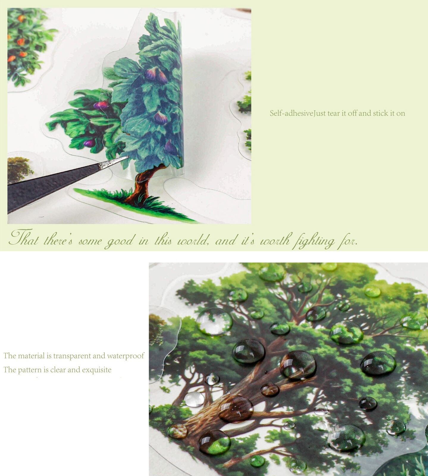 透明感のあるPET素材に繊細な木々を描いたシールです。春の桜、秋の紅葉、青々とした常緑樹や実をつけた果樹など、自然の美しさをそのまま閉じ込めたようなデザイン。手帳デコやコラージュ素材としてはもちろん、季節感を演出したいページ作りにもおすすめです。透明タイプなので背景になじみやすく、重ね貼りもしやすい仕様。植物モチーフやボタニカルデザインがお好きな方に取り入れていただきやすい商品です。