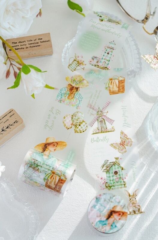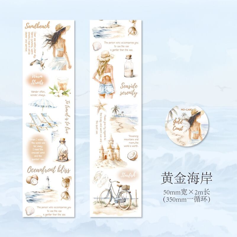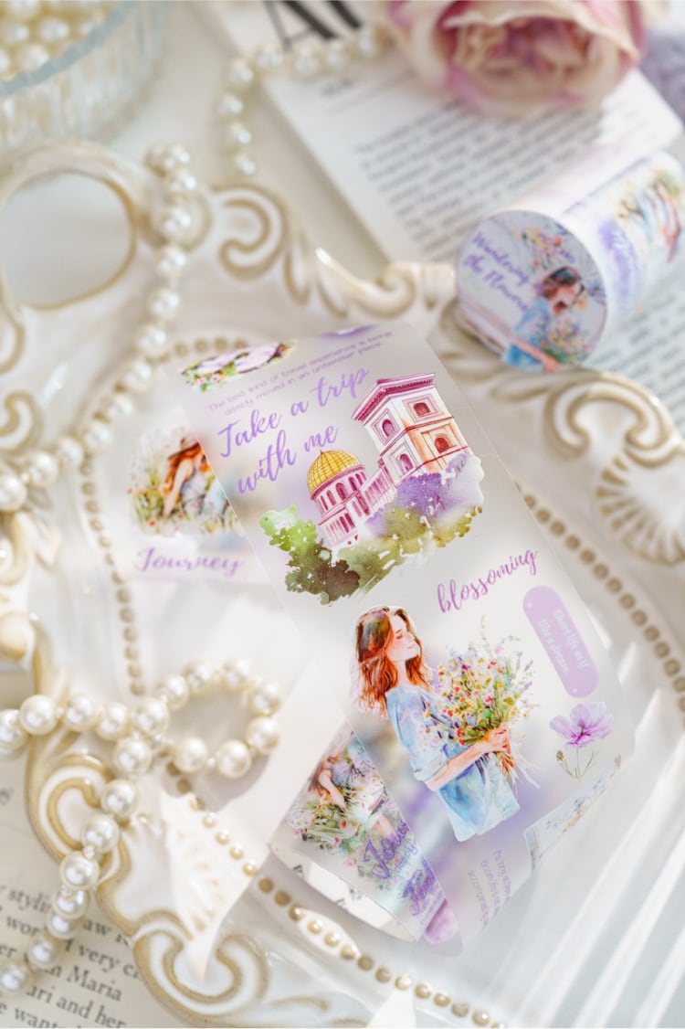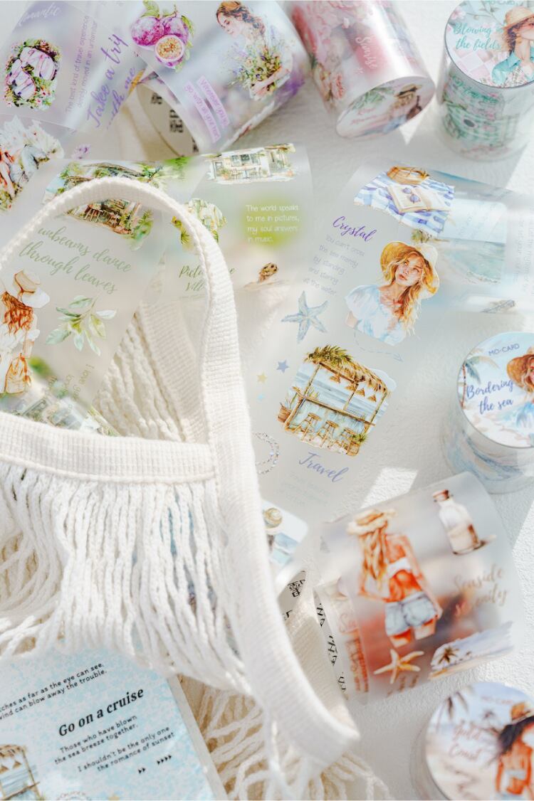 やわらかな水彩タッチで描かれた旅の風景や女の子、海辺や花々のモチーフを詰め込んだマスキングテープです。霧面PET素材の落ち着いた透け感があり、手帳デコやコラージュに重ねても主張しすぎず、背景とも自然に馴染みます。人物や風景を縦ラインに配置しやすく、日記ページやトラベラーズノート、アルバム装飾にも使いやすいデザインです。海テーマやフラワーコラージュ、ガーリーなページ作りにも取り入れやすく、季節を問わずお楽しみいただけます。旅の空気感をそっと添えたい方におすすめの商品です。