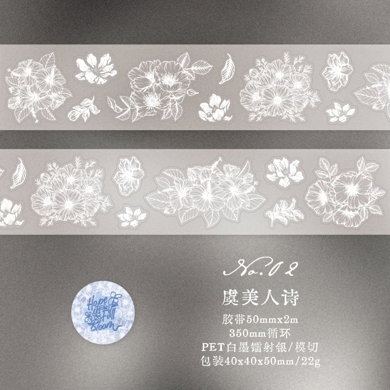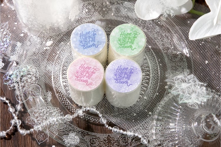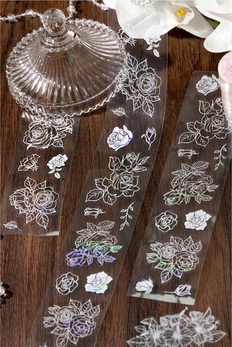 繊細な線で描かれた花のモチーフが印象的なPET素材のロールシールです。透明感のあるPETシールに白インクとホログラムの輝きが重なり、光の角度によってやさしくきらめく上品な雰囲気を楽しめます。バラや紫陽花、ユリなどさまざまなフラワーモチーフが揃っており、手帳デコやコラージュ素材としてページに軽やかなアクセントを添えてくれます。透明素材のため背景になじみやすく、素材紙や英字シール、人物シールなどと組み合わせたコラージュにも自然に溶け込みます。日記や手帳デコ、コラージュノート、スクラップなど幅広いアレンジに取り入れやすい商品です。