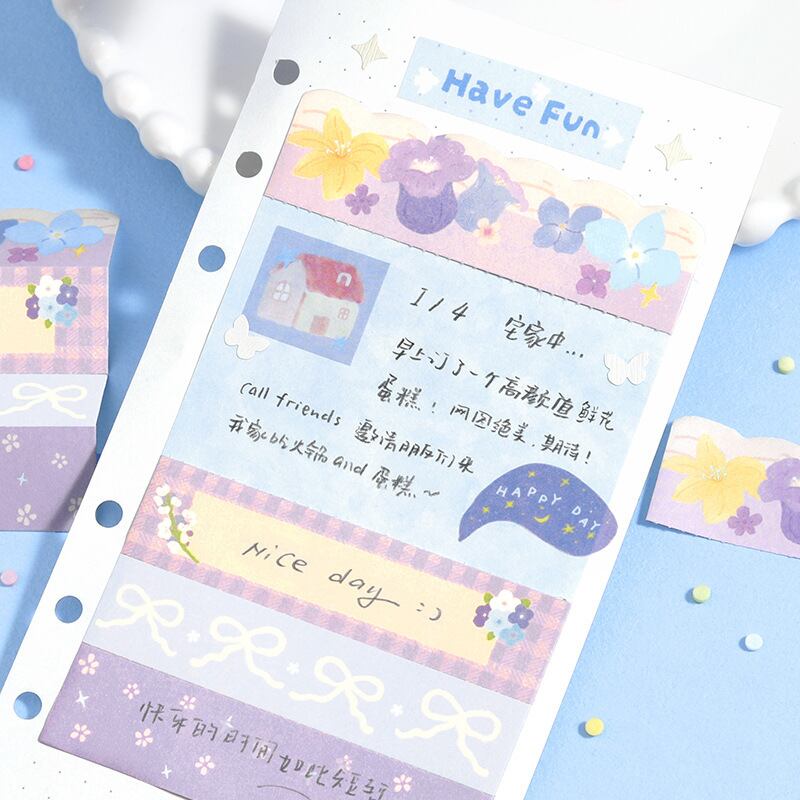 スイーツやお花をモチーフにしたやさしい色合いのデザイン付箋です。パステル調のイラストとかわいらしいモチーフが印象的で、手帳やノートのページに明るくやわらかな雰囲気を添えてくれます。ミシン目付きの付箋で必要な部分だけ切り取って使うことができ、メモを書いて手帳に貼ったり、ページのアクセントとしてコラージュ素材に取り入れるアレンジにも使いやすい仕様です。日記や手帳デコ、コラージュノート、スクラップなど幅広いページ作りに取り入れやすく、素材紙やシールと組み合わせたコラージュにも自然に馴染みます。