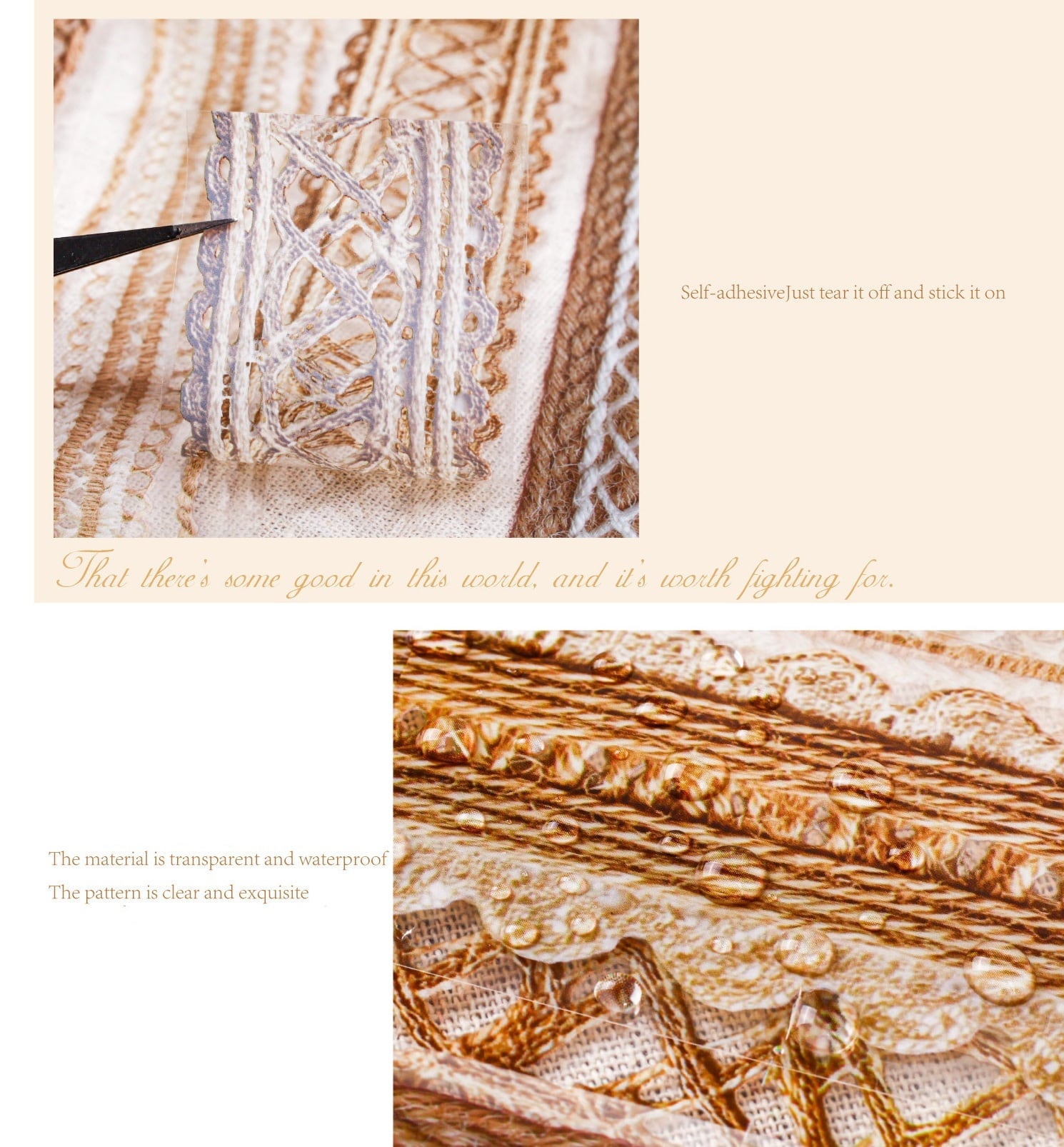 麻紐やレースのような繊細な模様が印象的な海外マスキングテープです。ナチュラルでヴィンテージ感のあるデザインは、手帳デコやコラージュ素材としてページに温かみを添えてくれます。透明感のあるPETテープなので背景になじみやすく、素材紙や英字素材、ラベルやタグと組み合わせても美しく仕上がります。手帳デコ、コラージュ、ジャンクジャーナル、スクラップブック、ラッピング装飾など幅広くお使いいただけます。コラージュ素材、手帳デコ素材、ヴィンテージ素材をお探しの方にもおすすめの商品です。