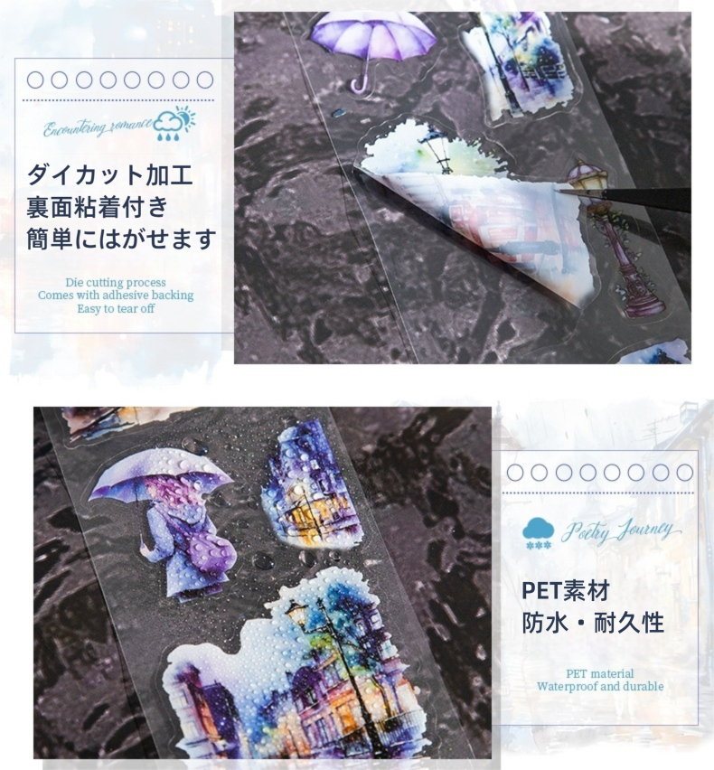 雨の夜の街並みや傘をさした人物、街灯や建物などを描いたロールシールです。透明感のあるPET素材に美しい夜景デザインが映え、コラージュや手帳デコに雰囲気のあるページを作ることができます。雨の街・ヨーロッパの街並み・クリスマス街並みなど物語のようなデザインが揃い、素材紙や英字素材、ヴィンテージ素材とも合わせやすい商品です。コラージュ素材、手帳デコ、ジャンクジャーナル、スクラップブック、海外シール、人物シール、街並みシールをお探しの方にもおすすめです。