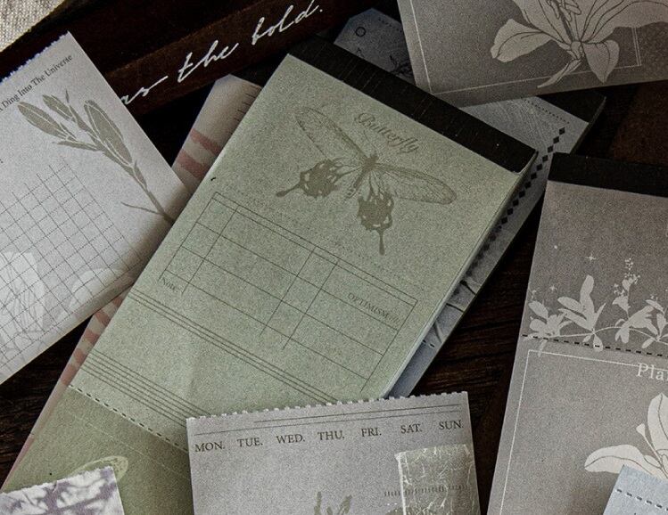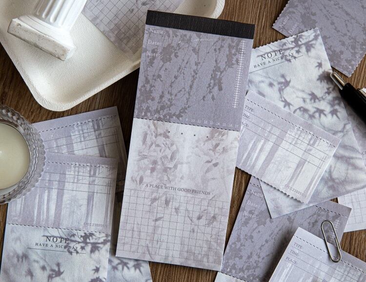 繊細な植物や光の影を閉じ込めたようなデザインが印象的な切り取り線入りメモです。やわらかな色合いと静かな雰囲気がコラージュや手帳デコに自然に溶け込み、重ねて使うことで奥行きのある表現を楽しめます。1枚ずつきれいに切り離せる仕様のため、コラージュ素材としてはもちろん、メモやラッピングの添え紙としても使いやすい仕上がりです。手帳デコ、コラージュ、ジャンクジャーナル、紙ものアレンジにおすすめの商品です。
