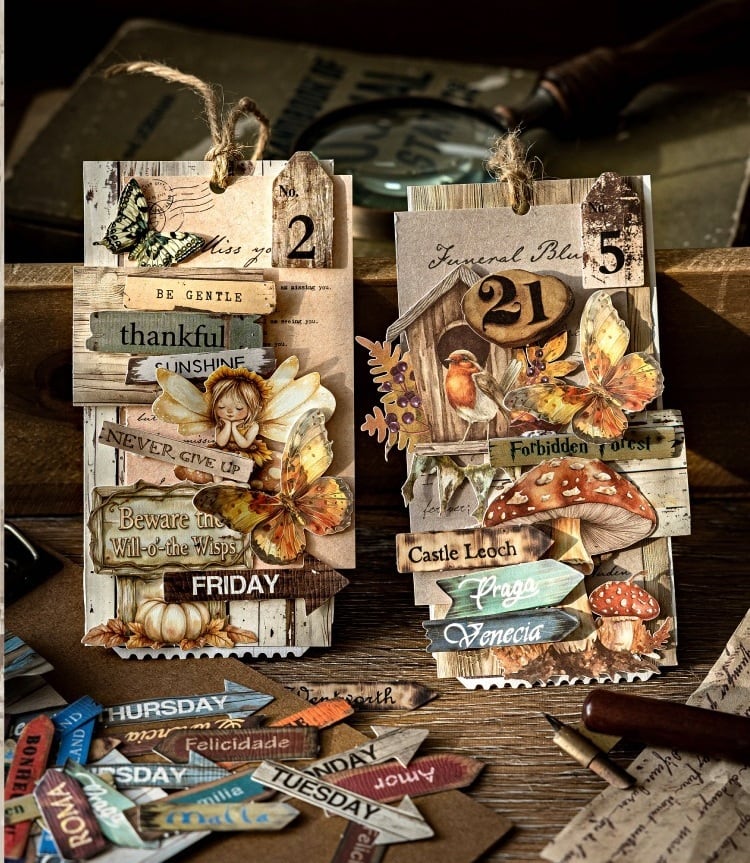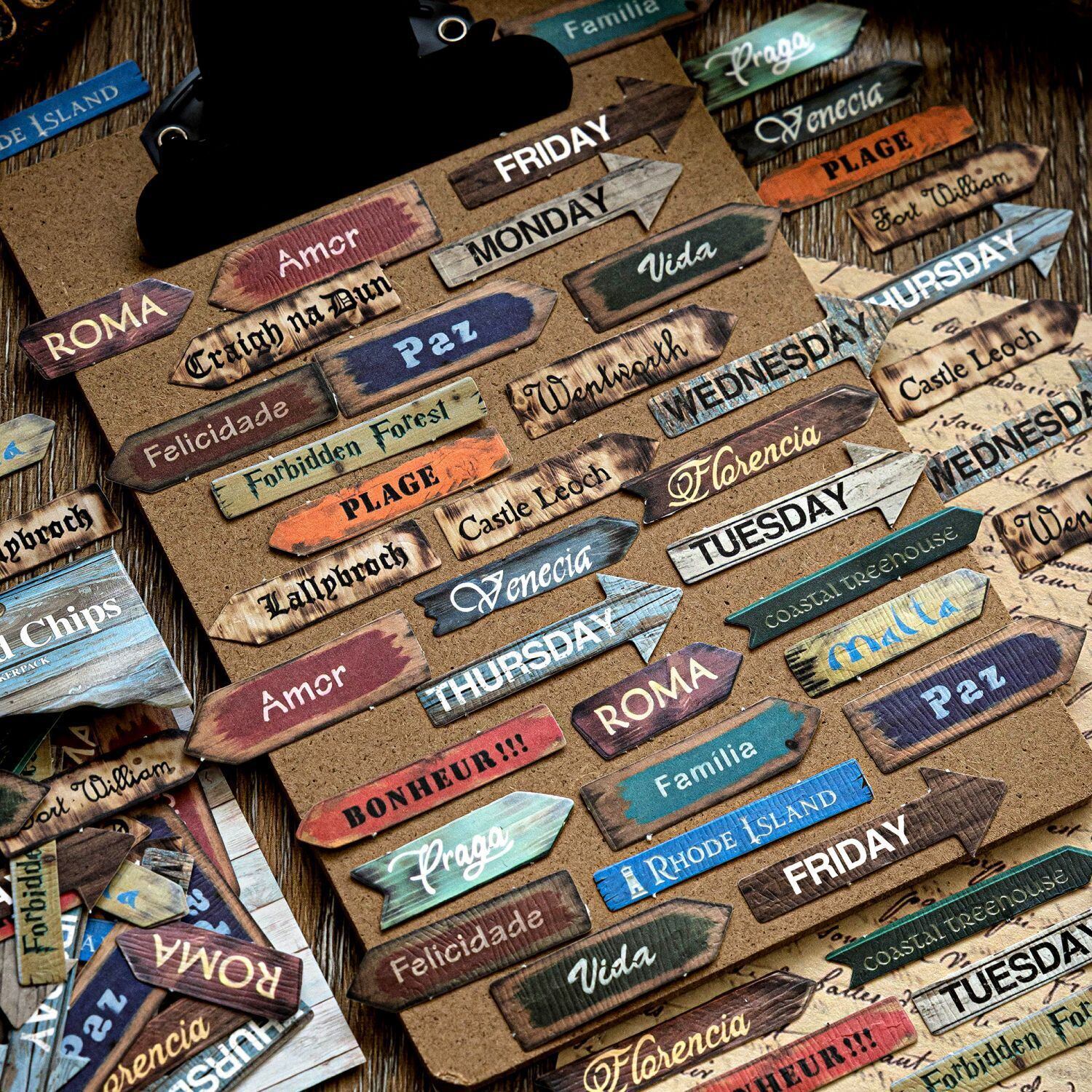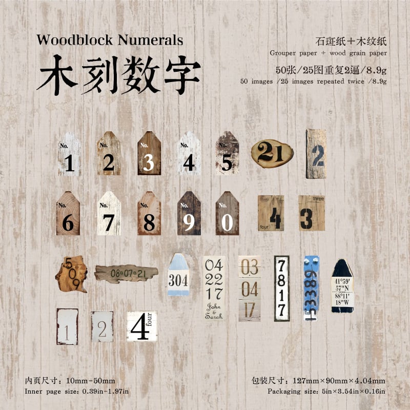 木目やウッドチップをモチーフにした英字ラベルデザインのフレークシールです。ヴィンテージ感のある木の質感と英字デザインが印象的で、手帳やコラージュノート、紙もののアレンジに落ち着いた雰囲気を添えてくれます。石斑紙と木紋紙を使用した紙素材で、細かな繊維の風合いと木目のニュアンスが感じられる自然な質感が魅力です。素材紙やラベルと組み合わせたコラージュにも自然に馴染み、数字やメッセージ、看板のような形のデザインがページのアクセントとして活躍します。日記や手帳デコ、スクラップ、コラージュページなど幅広いアレンジに取り入れやすいコラージュ素材として使いやすい商品です。