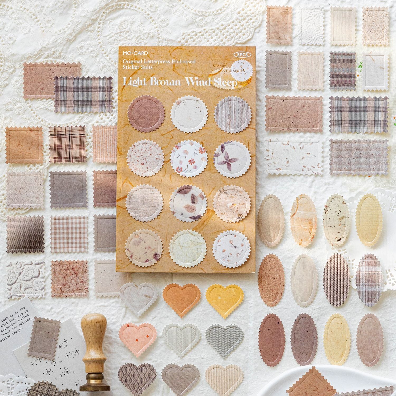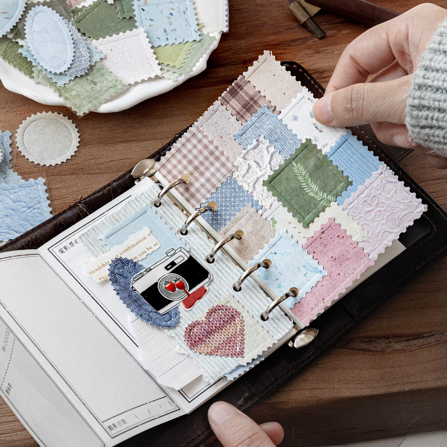 切手風デザインが印象的な紙素材のシートシールです。レトロな質感ややわらかな色合いのデザインが揃っており、貼るだけで手帳デコやコラージュにお洒落な雰囲気をプラスできます。エンボス加工が施されており、表面にさりげない凹凸があるため立体感のある仕上がりで、シンプルに貼るだけでも存在感が出ます。切手のような縁取りデザインでアクセントとして使いやすく、背景素材としても重ね貼りしやすいのが特徴です。紙素材ならではの自然な風合いで他のコラージュ素材ともなじみやすく、手帳デコ、コラージュ素材、シートシール、紙もの、ジャンクジャーナル、ノートアレンジに幅広く活用できます。切手風シールやエンボス加工シール、レトロデザインのコラージュ素材を探している方におすすめです。