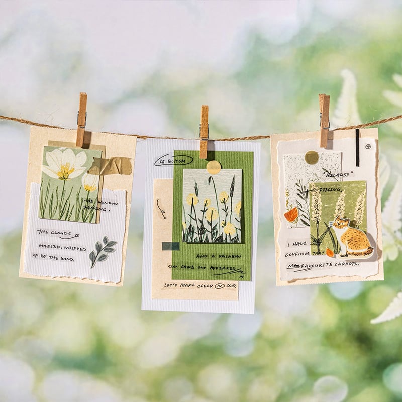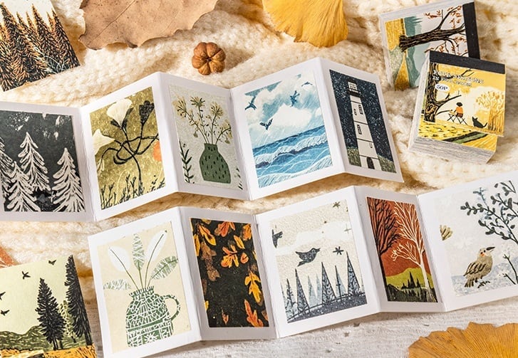 春夏秋冬の自然や植物、風景をやさしい色合いで描いたシールブックは、手帳デコやコラージュに季節感を取り入れたいときにぴったりのデザインです。小さめサイズのシールがまとまっているため持ち運びしやすく、ノートや日記、手帳ページのアクセントとして使いやすい仕様です。花や草木、海や森など幅広いモチーフが揃っており、ページにやわらかな雰囲気と統一感を添えてくれる商品です。