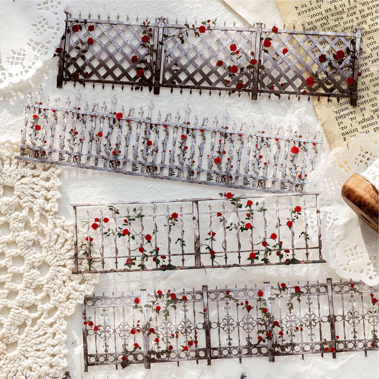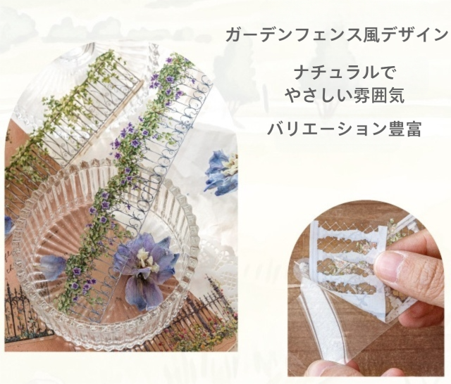 花とフェンスをモチーフにしたコラージュ素材として使いやすいPETシールです。透明シール仕様で背景になじみやすく、手帳デコ、コラージュ、ジャンクジャーナル、スクラップブック、日記、ラッピングなど幅広く活躍します。細長いデザインでライン装飾や境界デコにも使いやすく、ページに立体感と奥行きをプラスしてくれます。フラワー、ガーデン、アンティーク、ナチュラルテイストのデコレーションに相性が良く、海外シールならではの繊細な雰囲気も魅力です。バリエーション豊富なデザインで、組み合わせ次第でさまざまな表現をお楽しみいただけます。