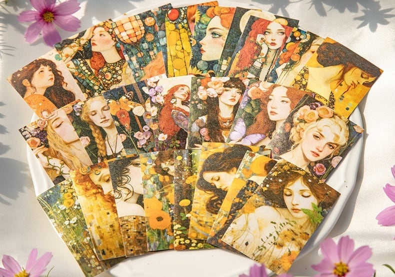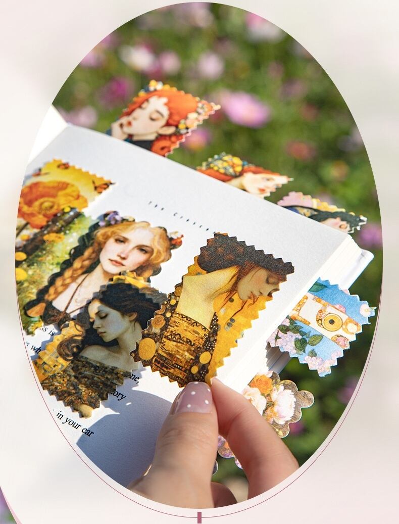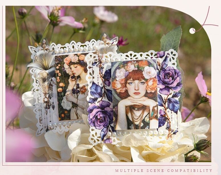 繊細な花々と美しい人物イラストが印象的なシールブックです。アンティーク調の色合いとアート感のあるデザインで、コラージュや手帳デコに奥行きのある雰囲気を添えてくれます。和紙素材ならではのやわらかな質感で紙になじみやすく、重ねて貼っても自然に仕上がるのが魅力です。1冊にまとまっているため持ち運びもしやすく、ページをめくりながらお気に入りを選べる楽しさもあります。コラージュ素材や手帳デコ素材、人物シールや花柄シールを探している方にも取り入れていただきやすい商品です。