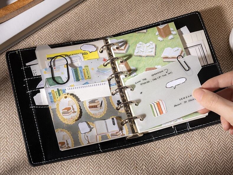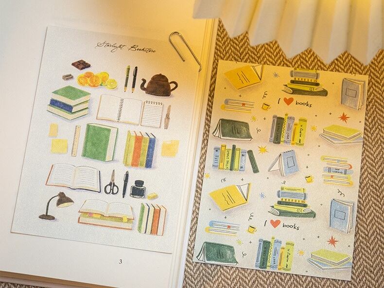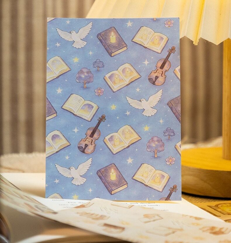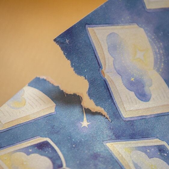 本や星、やさしい夜の世界観を詰め込んだ素材紙です。コラージュ素材や手帳デコ、日記デコに取り入れやすい落ち着いたデザインで、貼る・切る・重ねるだけで自然に雰囲気のあるページに仕上がります。パールのような質感の紙素材を使用しており、光の角度によってほんのりと輝く上品な風合いが特徴です。猫や本棚、カフェのモチーフなど日常に寄り添うイラストが揃っており、コラージュ初心者の方でも扱いやすいのも魅力です。手帳やノートのデコレーションはもちろん、ラッピングやカード作り、背景素材としても幅広くお使いいただける商品です。