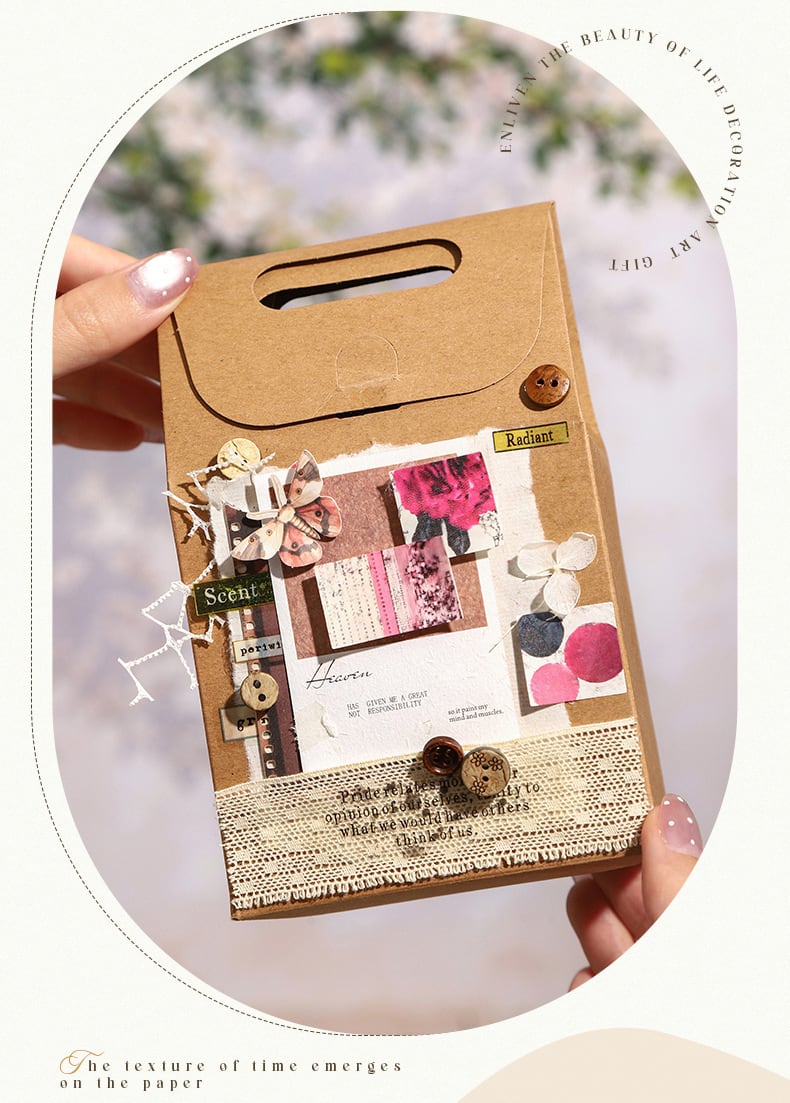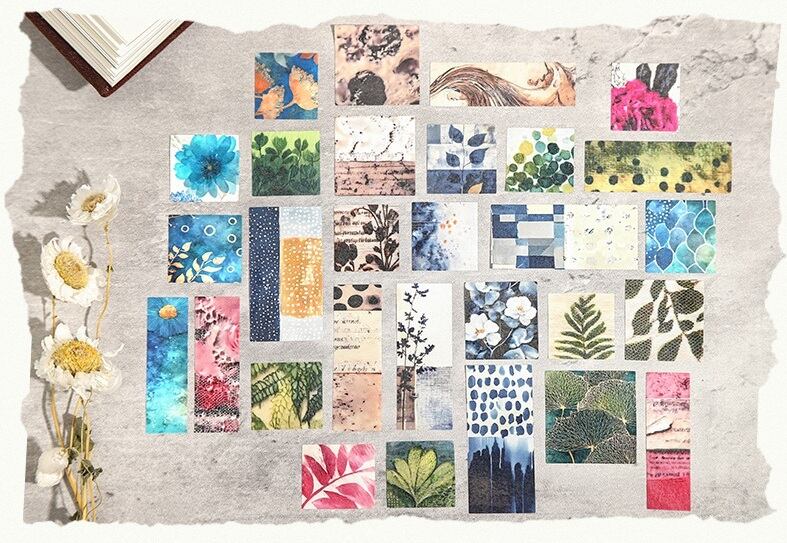 花やテクスチャ、抽象的な模様が美しく組み合わされたコラージュ素材のロールシールです。色の重なりや繊細なデザインが印象的で、手帳デコやコラージュにやわらかな雰囲気と奥行きを添えてくれます。小さめのフレームデザインで、切り分けて使いやすく、アレンジの幅が広がるのも魅力のひとつです。紙素材ならではの自然な質感があり、他の素材ともなじみやすく、やさしい印象に仕上がります。手帳デコやコラージュのアクセントとして取り入れやすく、日常使いから作品づくりまで幅広く活躍します。