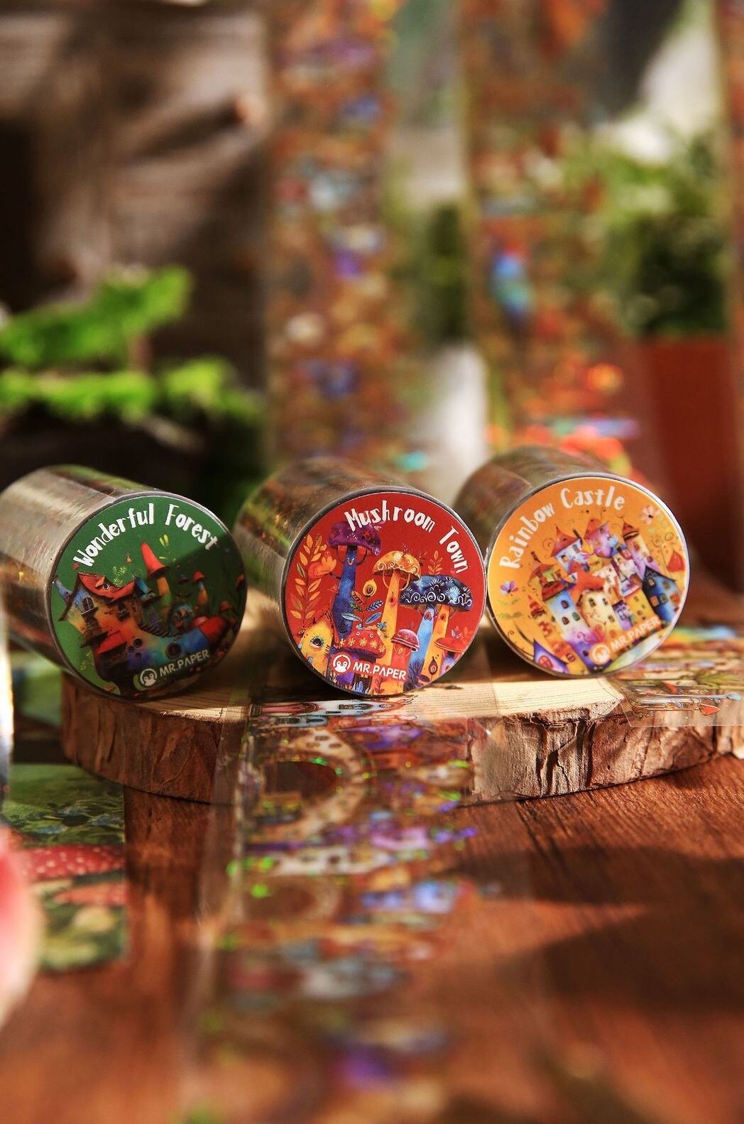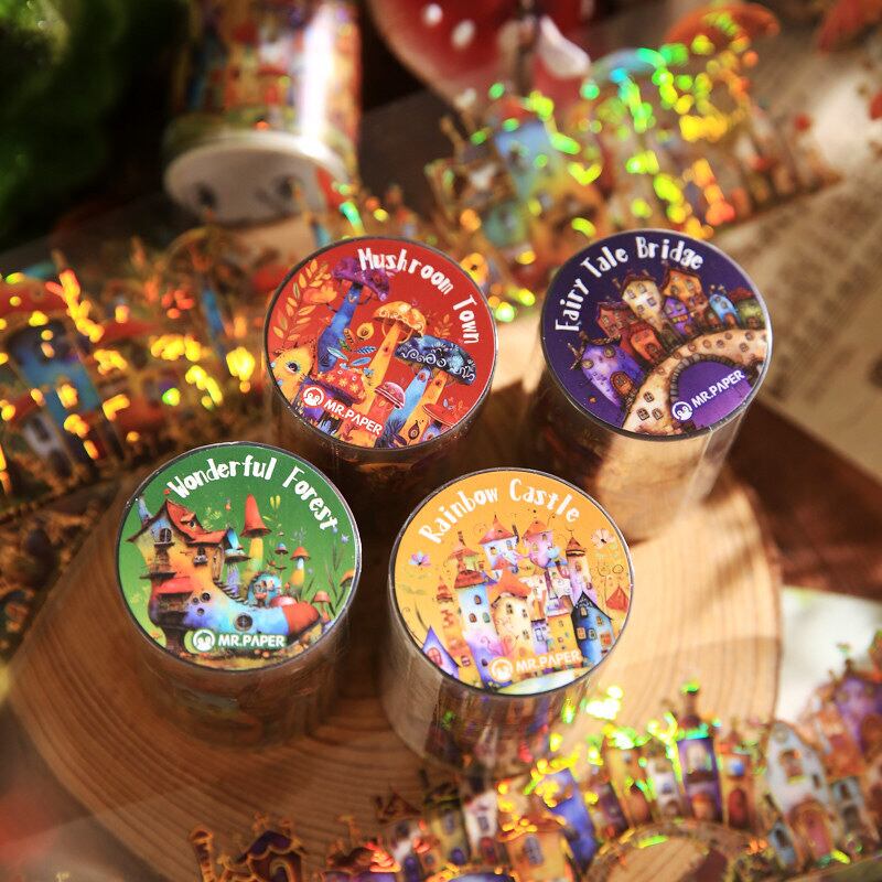 童話の中に迷い込んだような、やわらかく幻想的な街並みを描いたマスキングテープ。小さな家々が連なる橋や、きのこが広がる不思議な風景、彩り豊かな城のデザインが続き、ひと貼りするだけでページに物語のような広がりが生まれます。幅のあるテープなので背景づくりにも使いやすく、コラージュ素材として空間をやさしく埋めながら、自然な奥行きを演出できる仕上がり。手帳デコやジャンクジャーナル、アルバム装飾にも取り入れやすく、重ねて貼ることでさらに表情の変化も楽しめます。海外文具ならではの繊細な色合いとファンタジーな世界観を、日常のデコレーションにさりげなく取り入れたい方におすすめです。