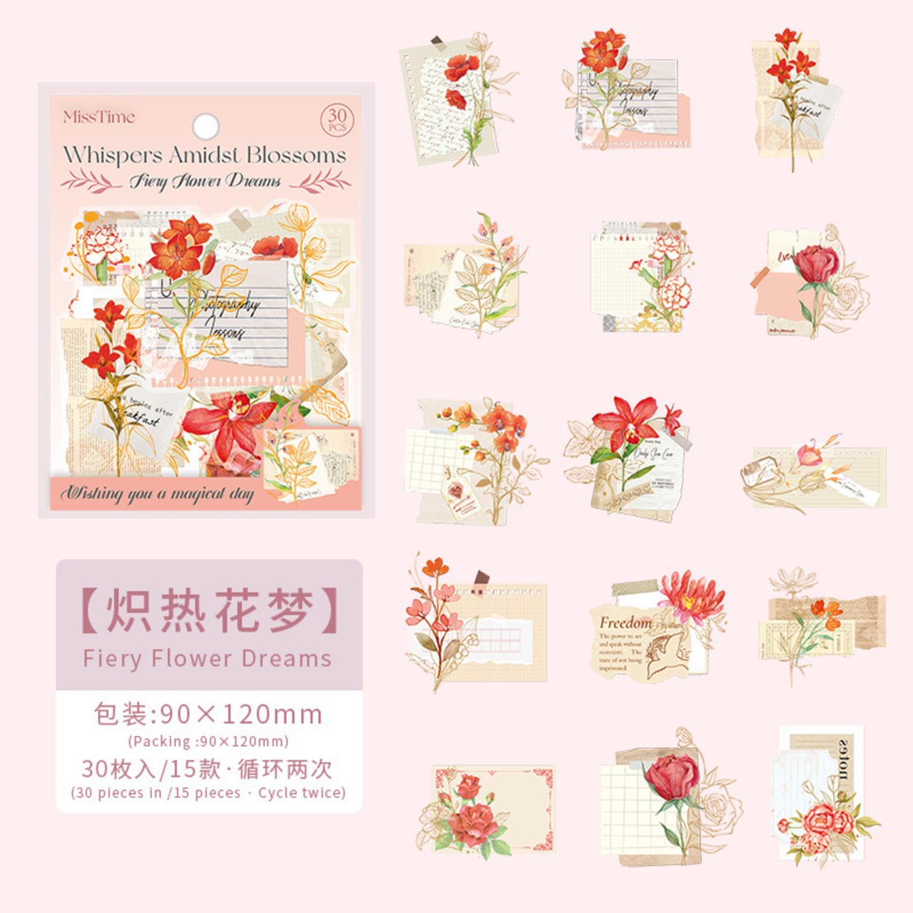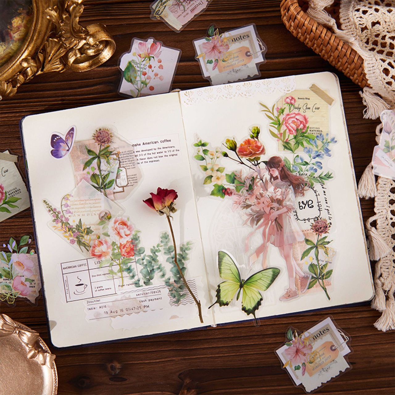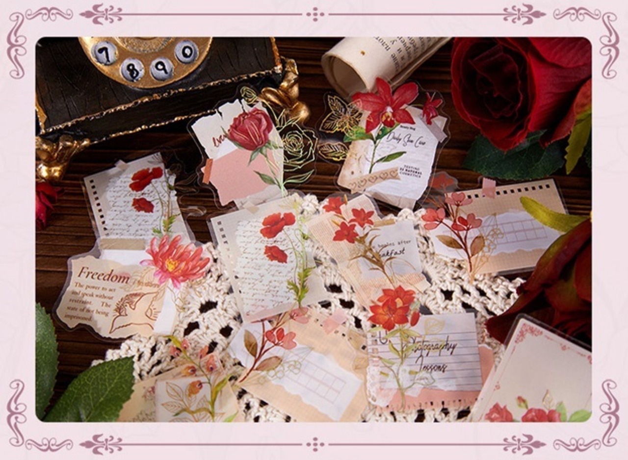 柔らかいカラーの花が美しく描かれたフレークシールです。優雅な花々のデザインが手帳やノートのデコレーションを優しく彩ります。