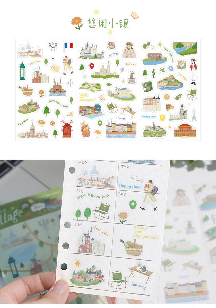 都市の風景をモチーフにした、洗練されたデザインのシートシールです。街並みや建物をテーマにしたアートなコラージュをお楽しみいただけます。お気に入りのデザインを使って、手帳やノートのデコレーションにぜひご活用ください。