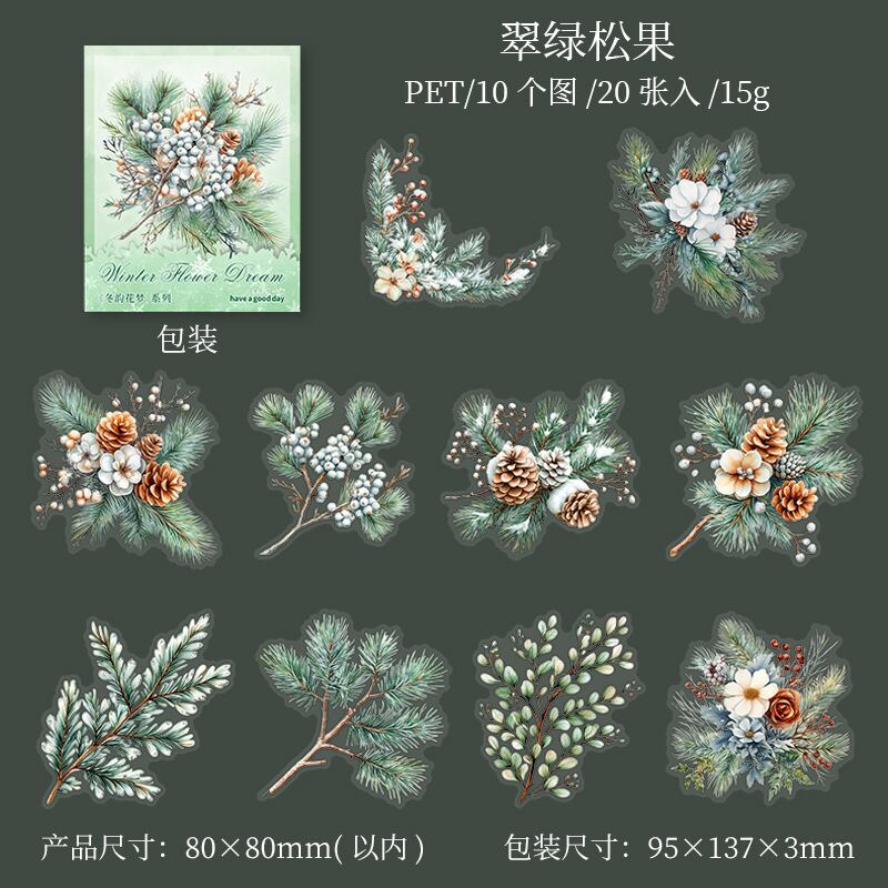 華やかな冬の花々をテーマにしたシールです。コラージュにお使いいただくことによって、冬の季節感を楽しむことができます。多彩なデザインでクリエイティブな世界を広げてみてください。