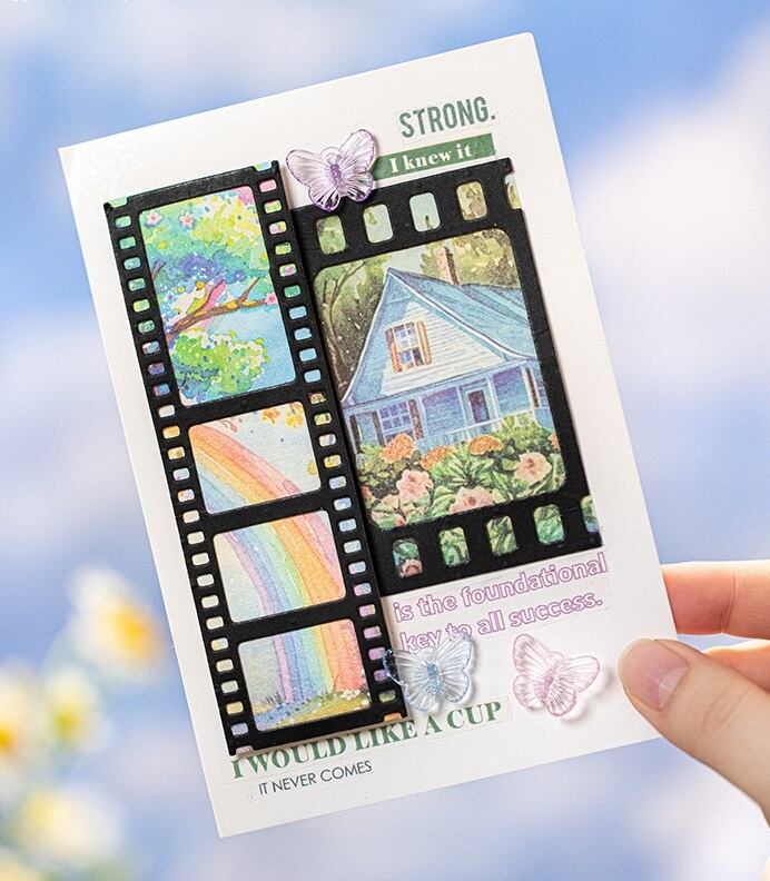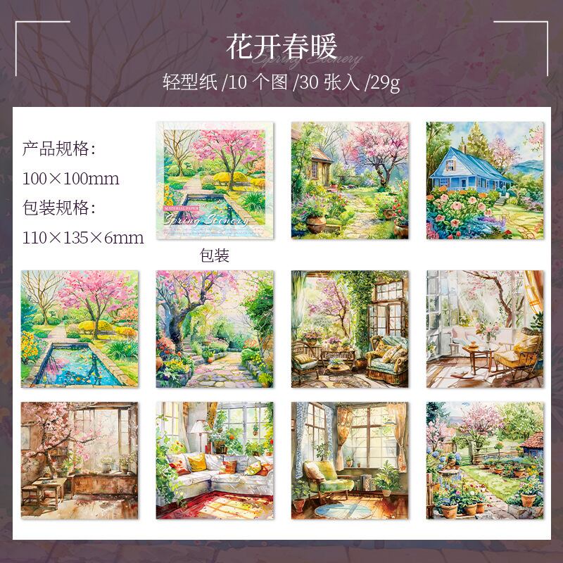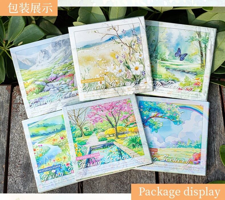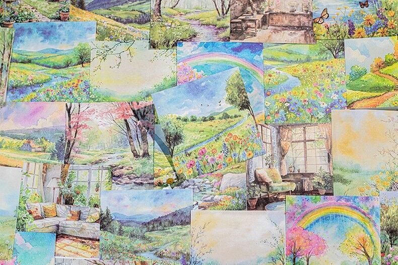 美しい風景を描いた、心温まるデザインの素材紙です。春の訪れを感じさせる穏やかな色合いと独自のタッチが特長で、クラフトやメッセージカードの作成にもおすすめです。